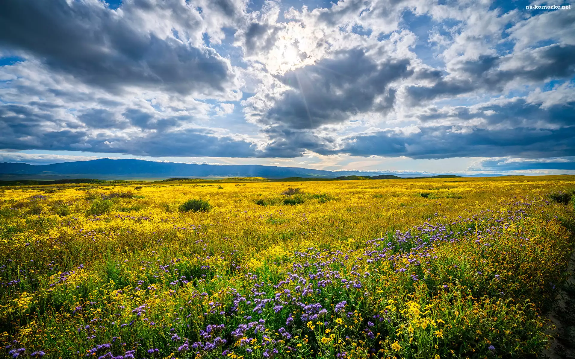 Kwiaty, Promienie słoneczne, Stany Zjednoczone, Chmury, Pomnik Narodowy Równiny Carrizo, Łąka, Kalifornia na Komórkę |