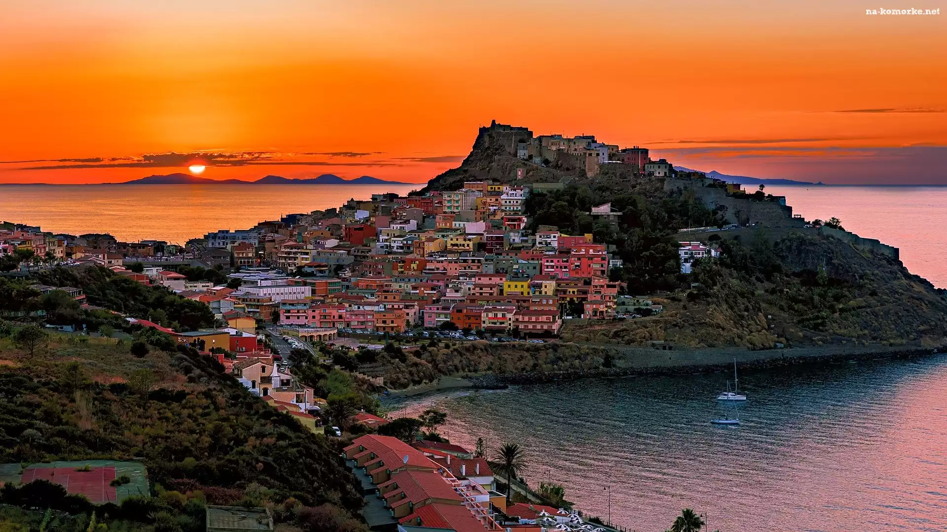 Sardynia, Zachód słońca, Castelsardo, Włochy, Domy, Morze na Komórkę