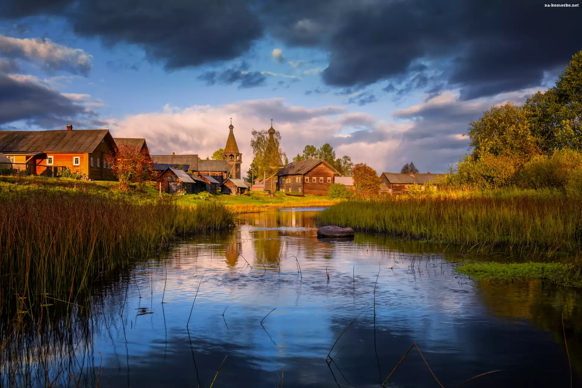 Obwód archangielski, Chmury, Jezioro, Domy, Trzciny, Wschód słońca, Wieś, Cerkiew, Drzewa, Rosja na Komórkę |