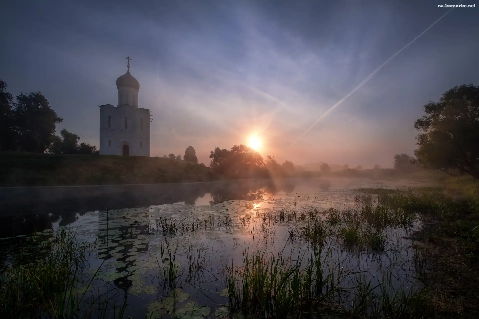 Cerkiew Opieki Matki Bożej, Rzeka Nerl, Wschód słońca, Drzewa, Rosja, Brzeg, Obwód włodzimierski, Szuwary, Bogolubowo na Komórkę |