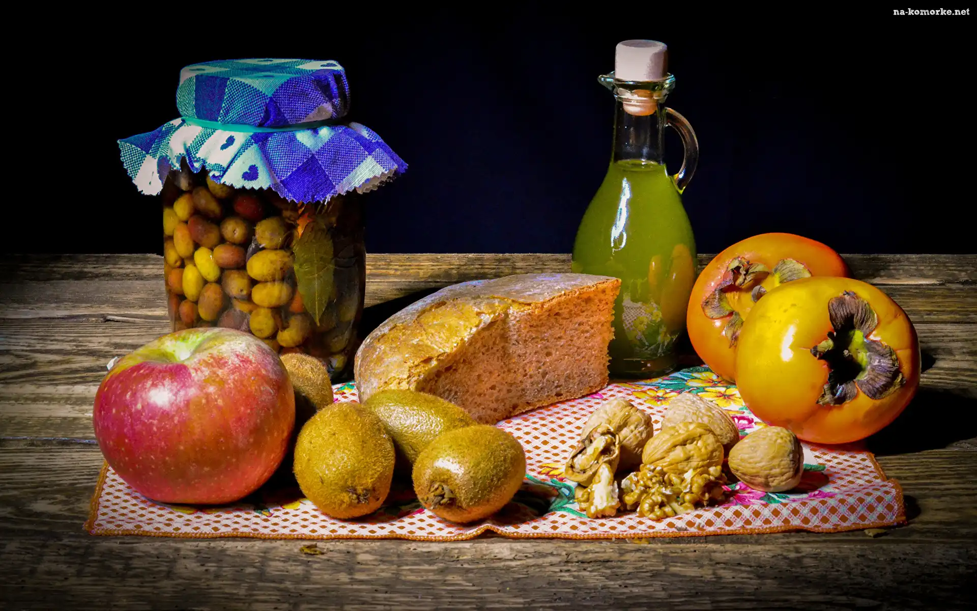 Kiwi, Kompozycja, Kaki, Orzechy, Butelka, Jabłko, Słoik, Persymony, Chleb na Komórkę
