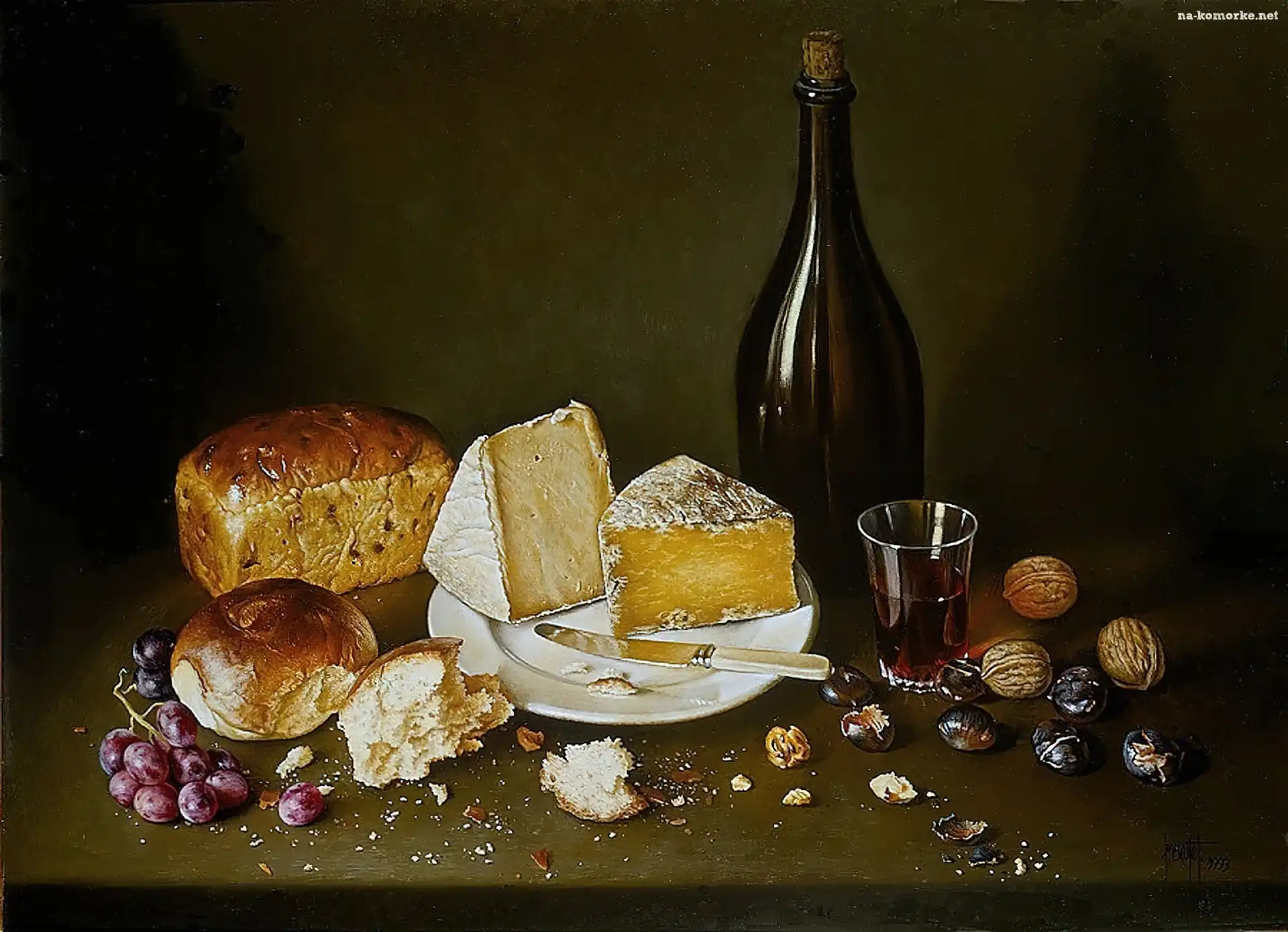 Chleb, Wino, Butelka, Stół, Ser, Winogrona na Komórkę