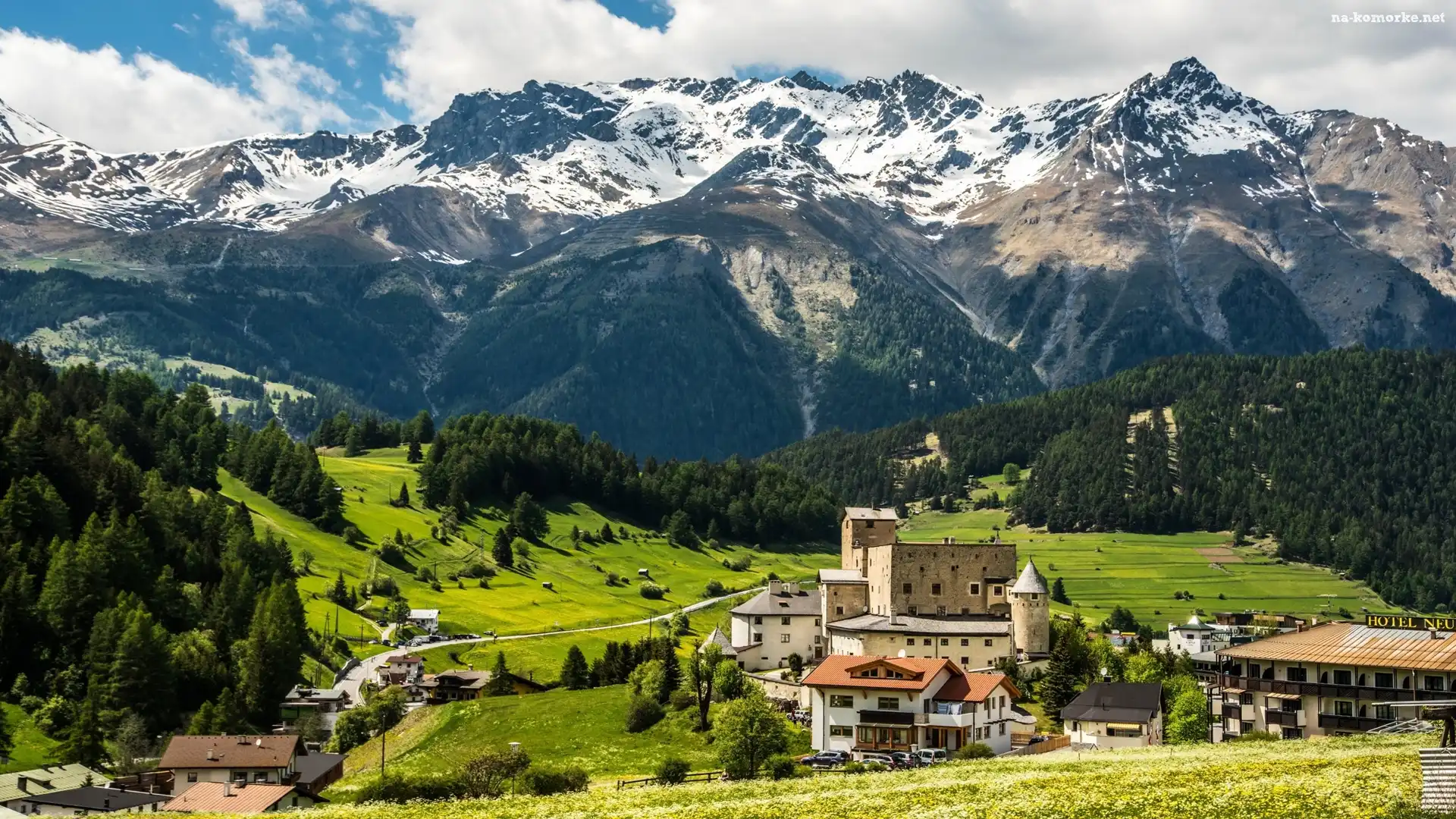 Chmury, Góry, Las, Domy, Droga na Komórkę