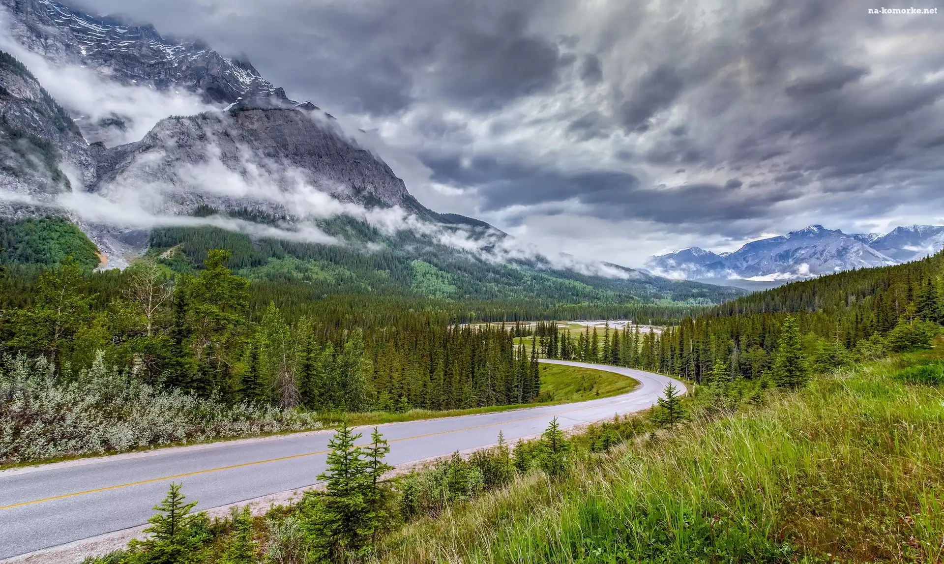 Chmury, Góry, Droga, Drzewa, Lasy na Komórkę