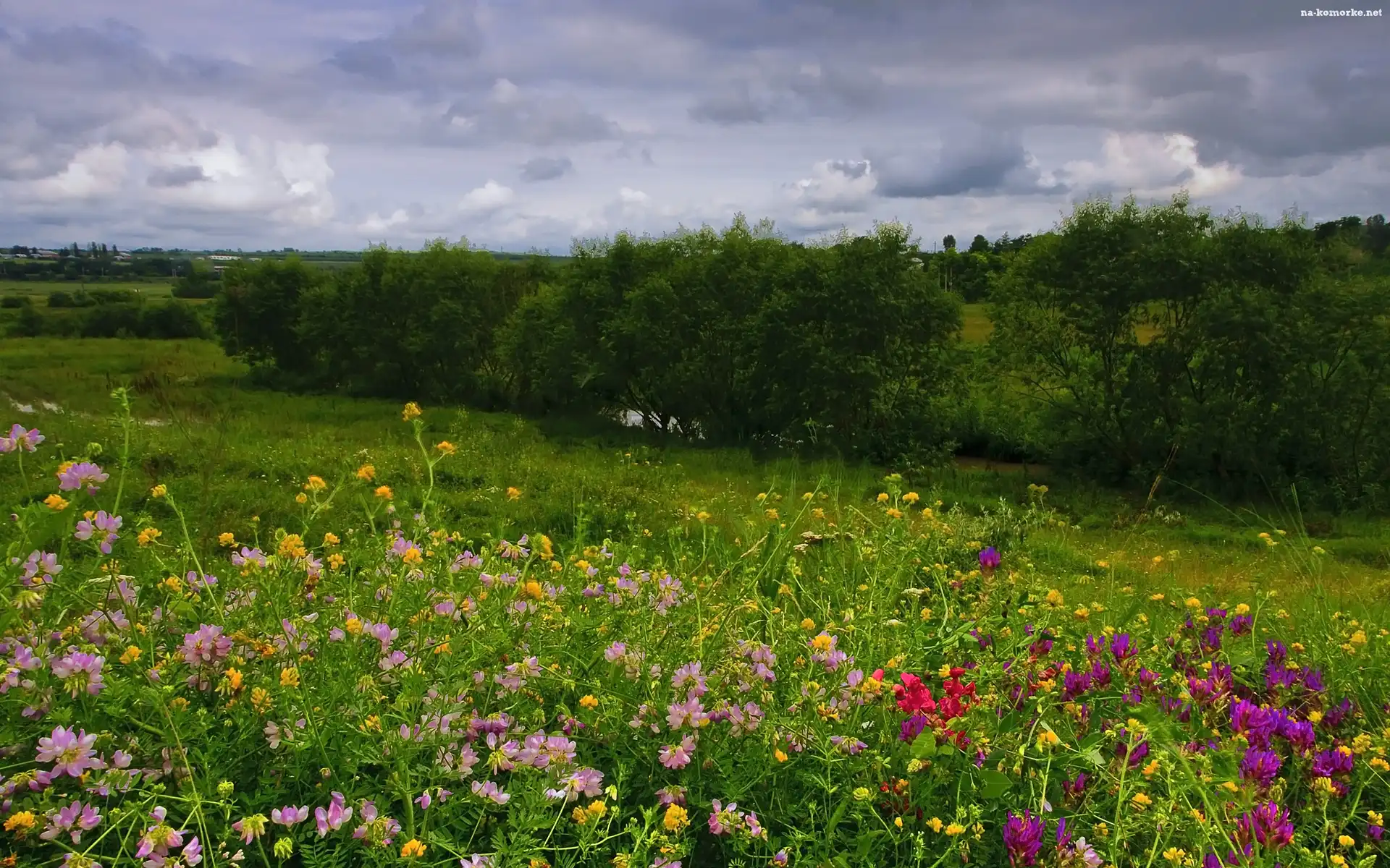 Chmury, Łąka, Kwiaty, Drzewa, Rzeka na Komórkę