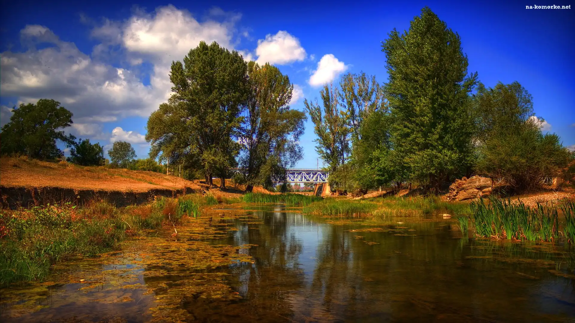 Chmury, Rzeka, Most, Drzewa, Trawy na Komórkę