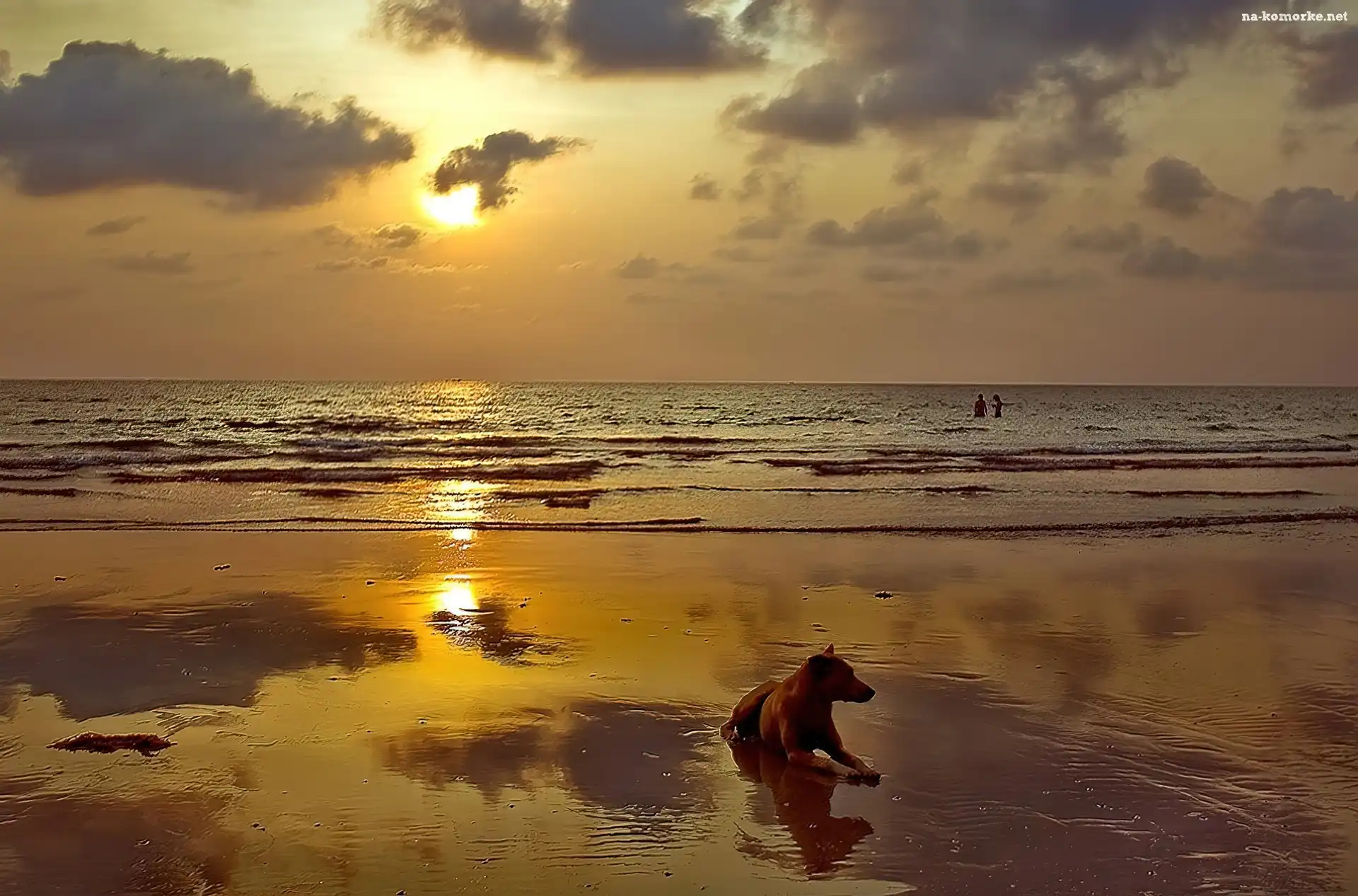 Chmury, Pies, Morze, Fale, Plaża na Komórkę