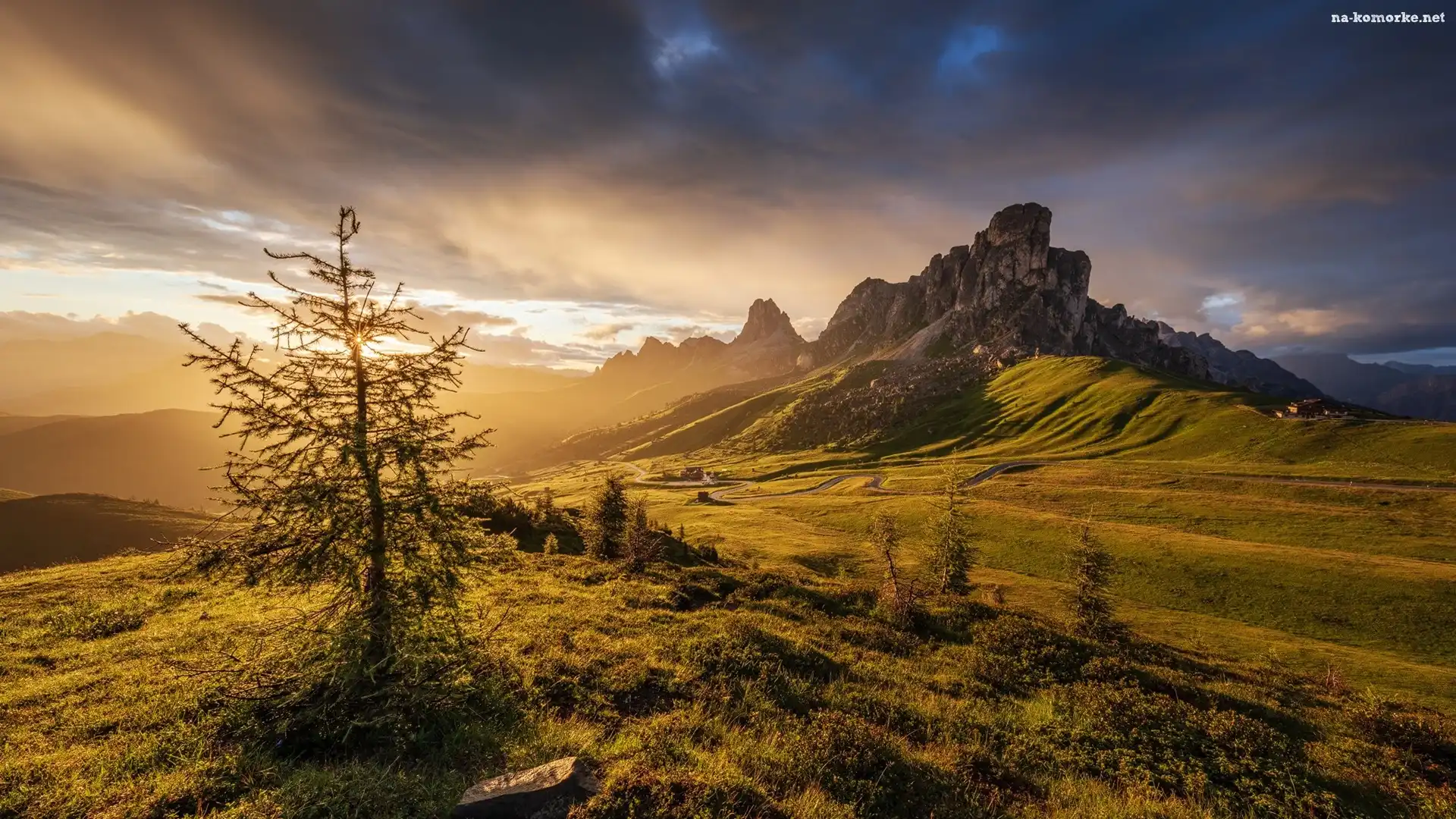 Góra Ra Gusela, Góry, Chmury, Przełęcz Giau Pass, Włochy, Dolomity, Drzewo, Wschód słońca, Droga na Komórkę |