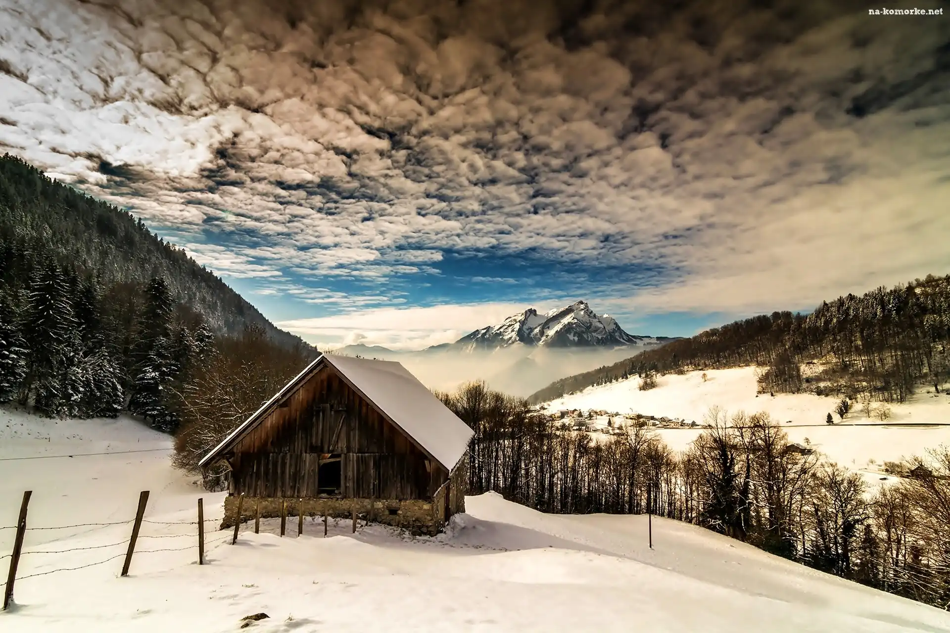 Chmury, Zima, Śnieg, Góry, Domek na Komórkę