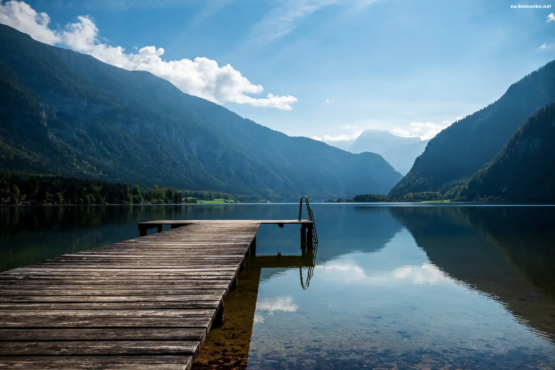 Chmury, Jezioro, Pomost, Góry, Drzewa na Komórkę