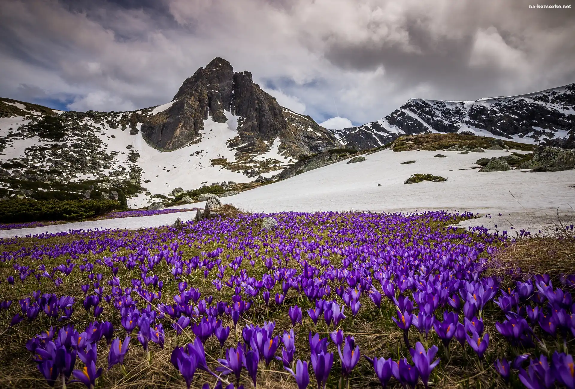 Łąka, Góry, Zima, Chmury, Krokusy na Komórkę