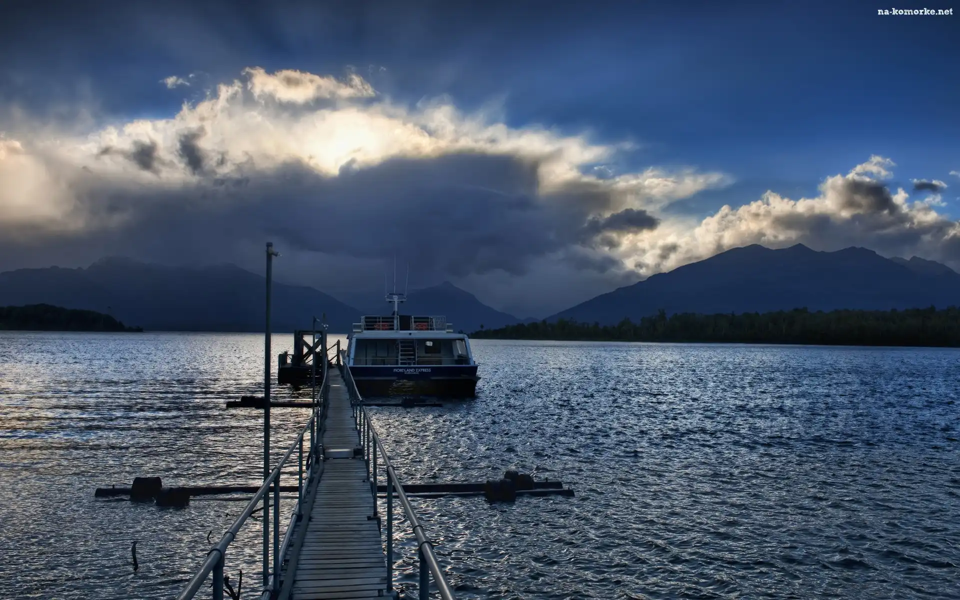 Chmury, Rzeka, Góry, Jacht, Pomost na Komórkę