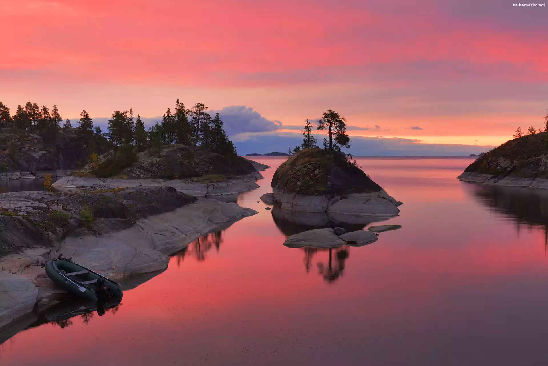 Chmury, Zachód słońca, Jezioro, Skały, Rosja, Wysepka, Odbicie, Karelia, Ładoga, Kamienie, Ponton, Drzewa na Komórkę |