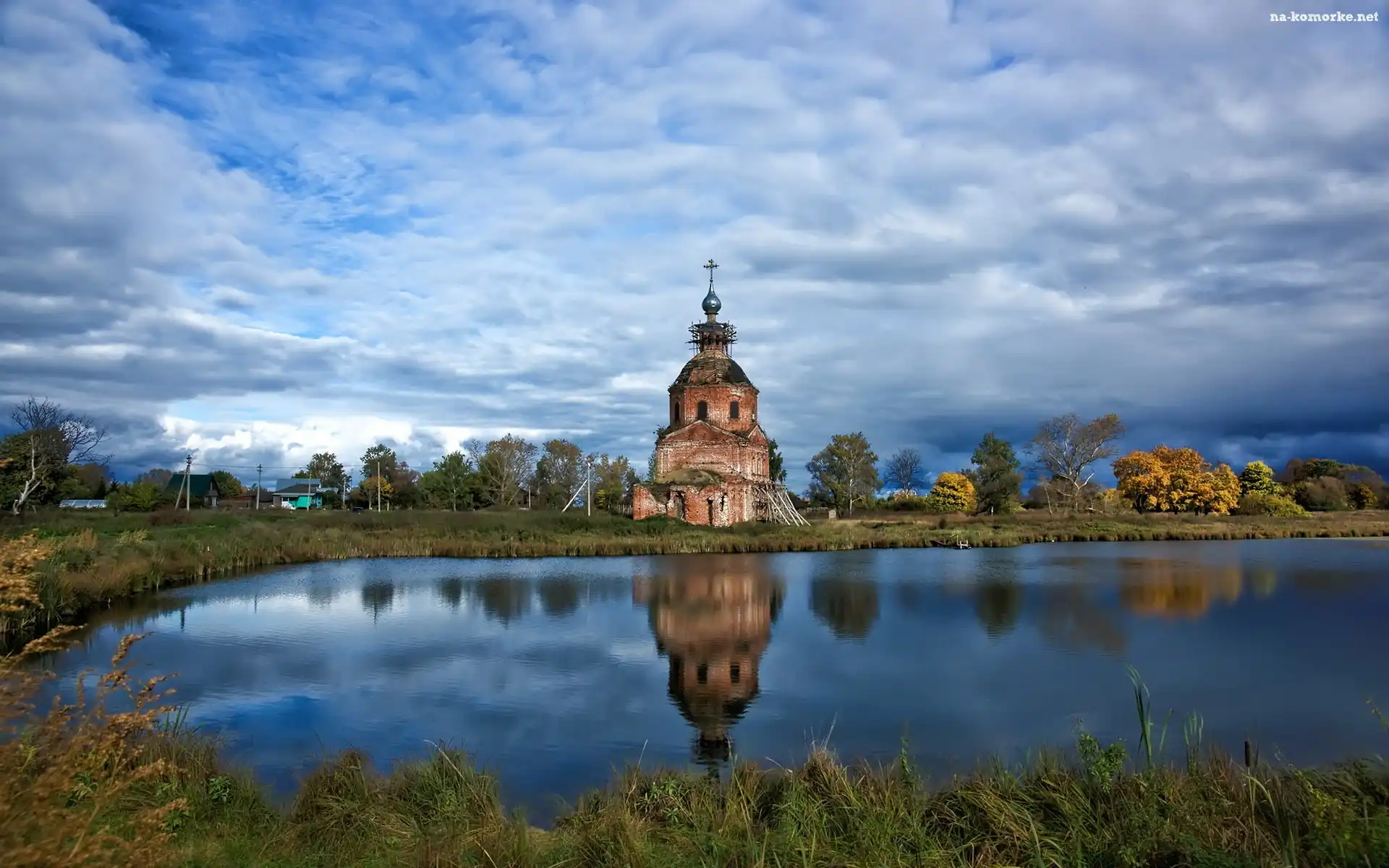 Chmury, Cerkiew, Ruiny, Jezioro, Drzewa na Komórkę