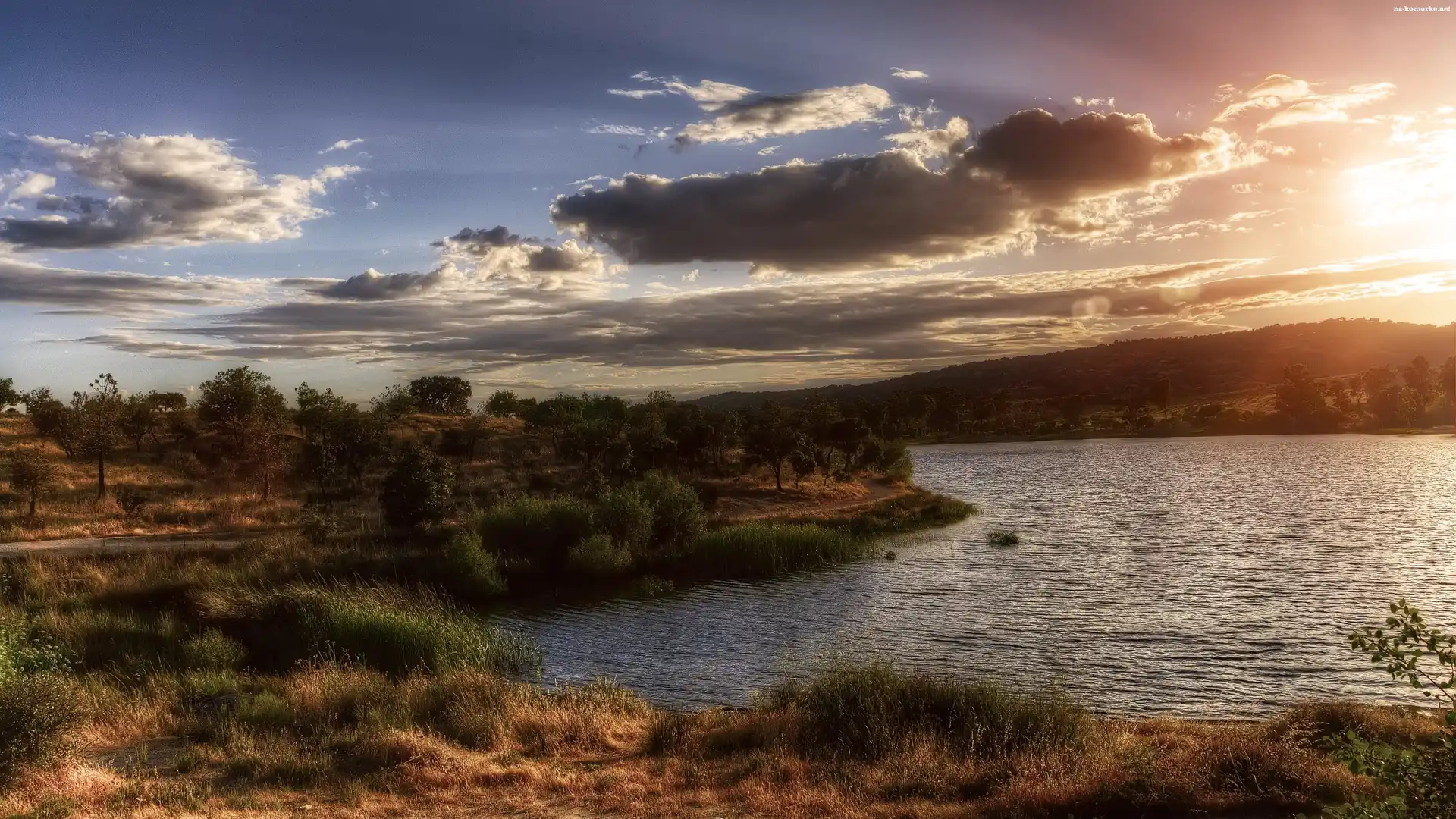 Chmury, Zachód, Słońca, Jezioro, Drzewa na Komórkę