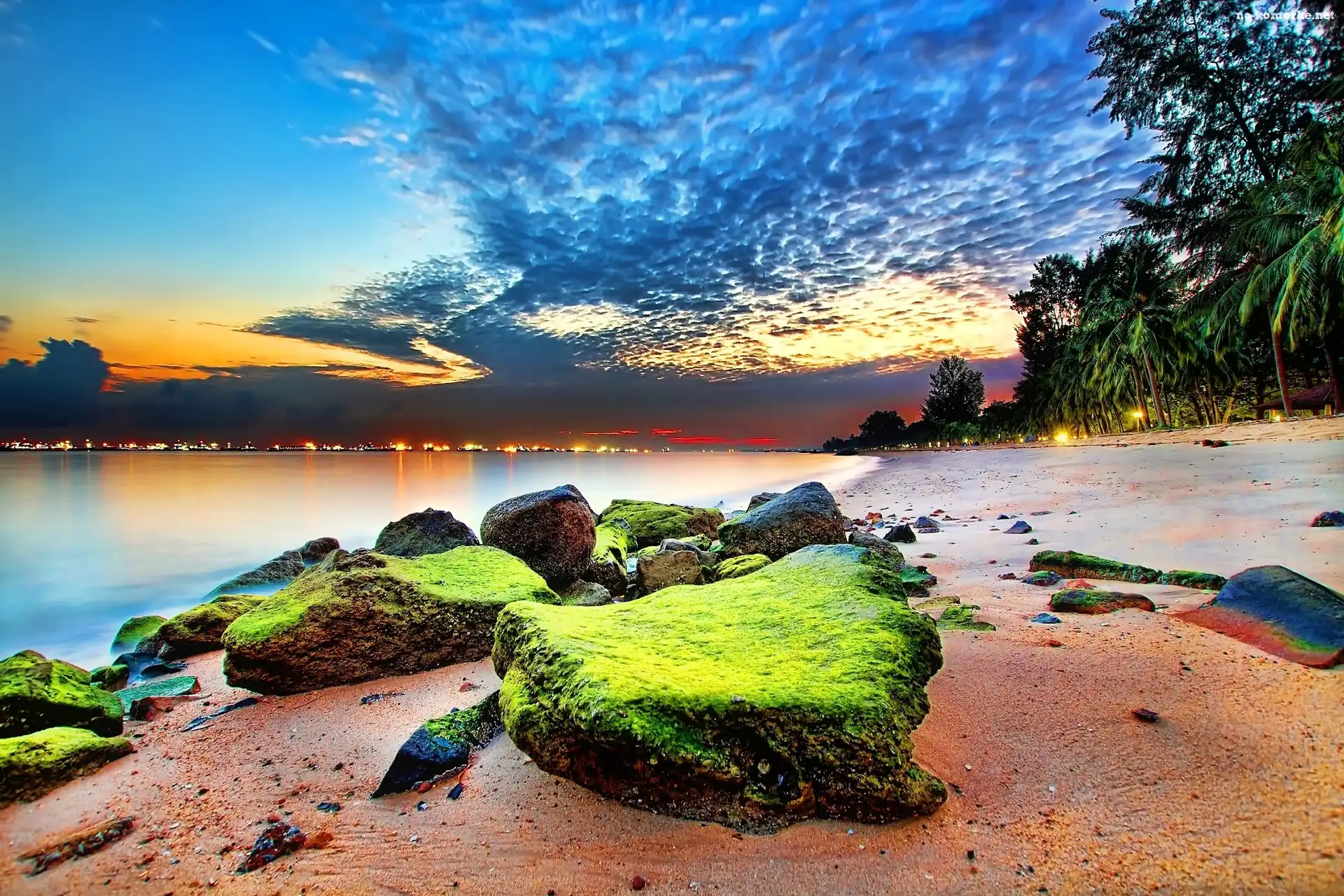 Chmury, Brzeg, Morze, Miasto, Kamienie, Drzewa na Komórkę