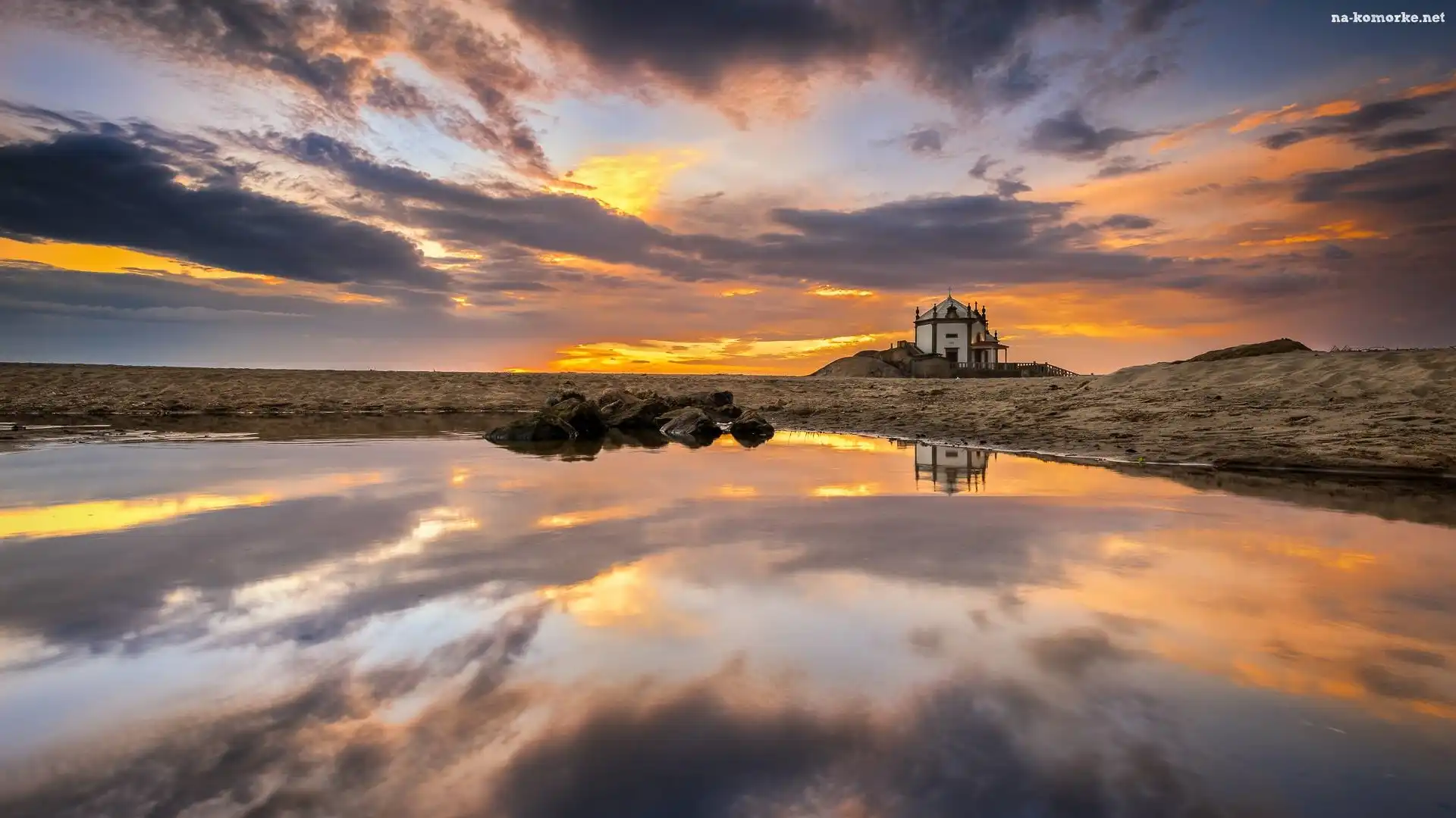 Kapliczka, Portugalia, Morze, Kościół, Chmury, Miramar, Zachód słońca, Capela do Senhor da Pedra, Skały na Komórkę |