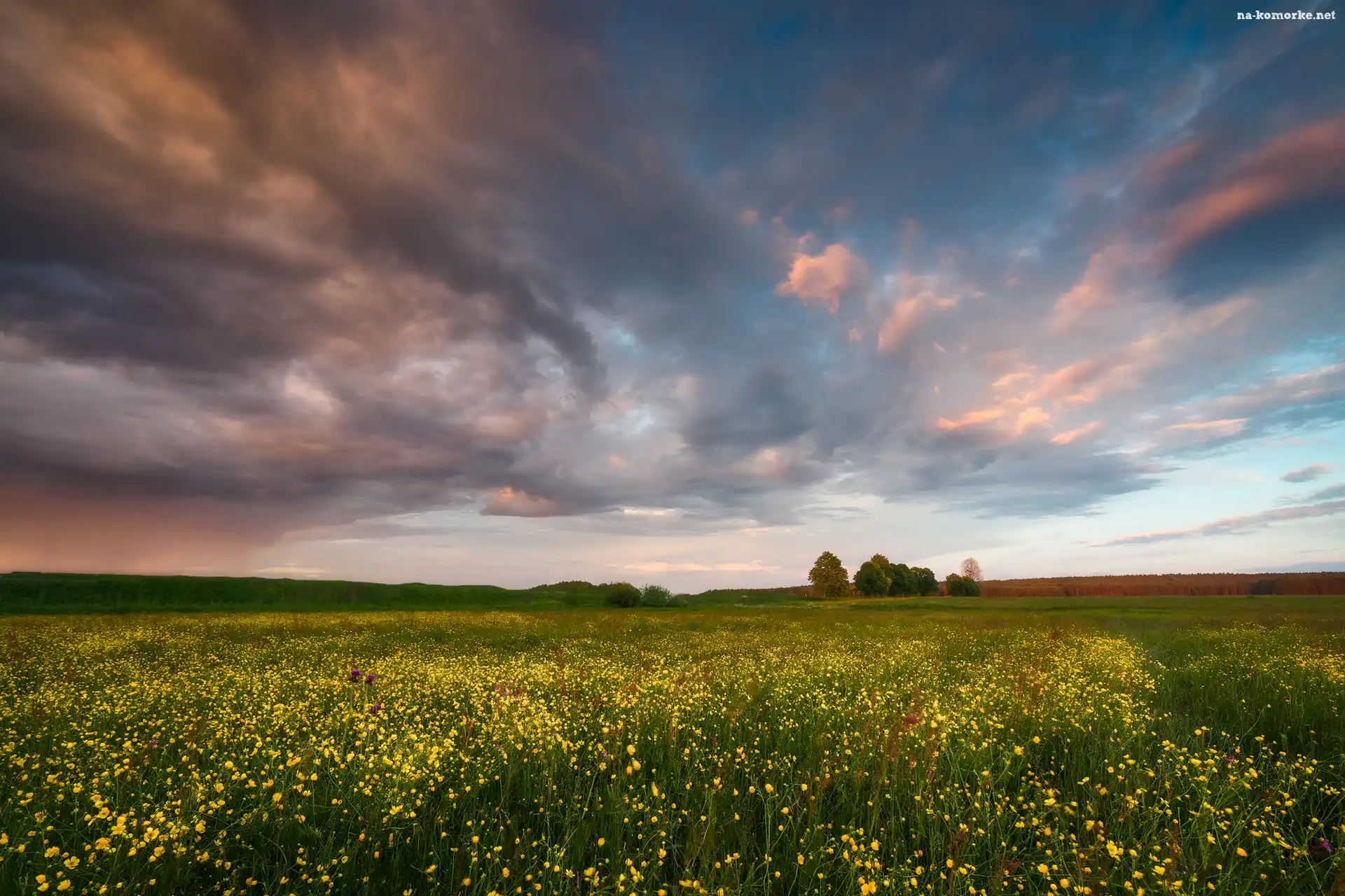 Chmury, Łąka, Żółte, Kwiaty, Drzewa na Komórkę