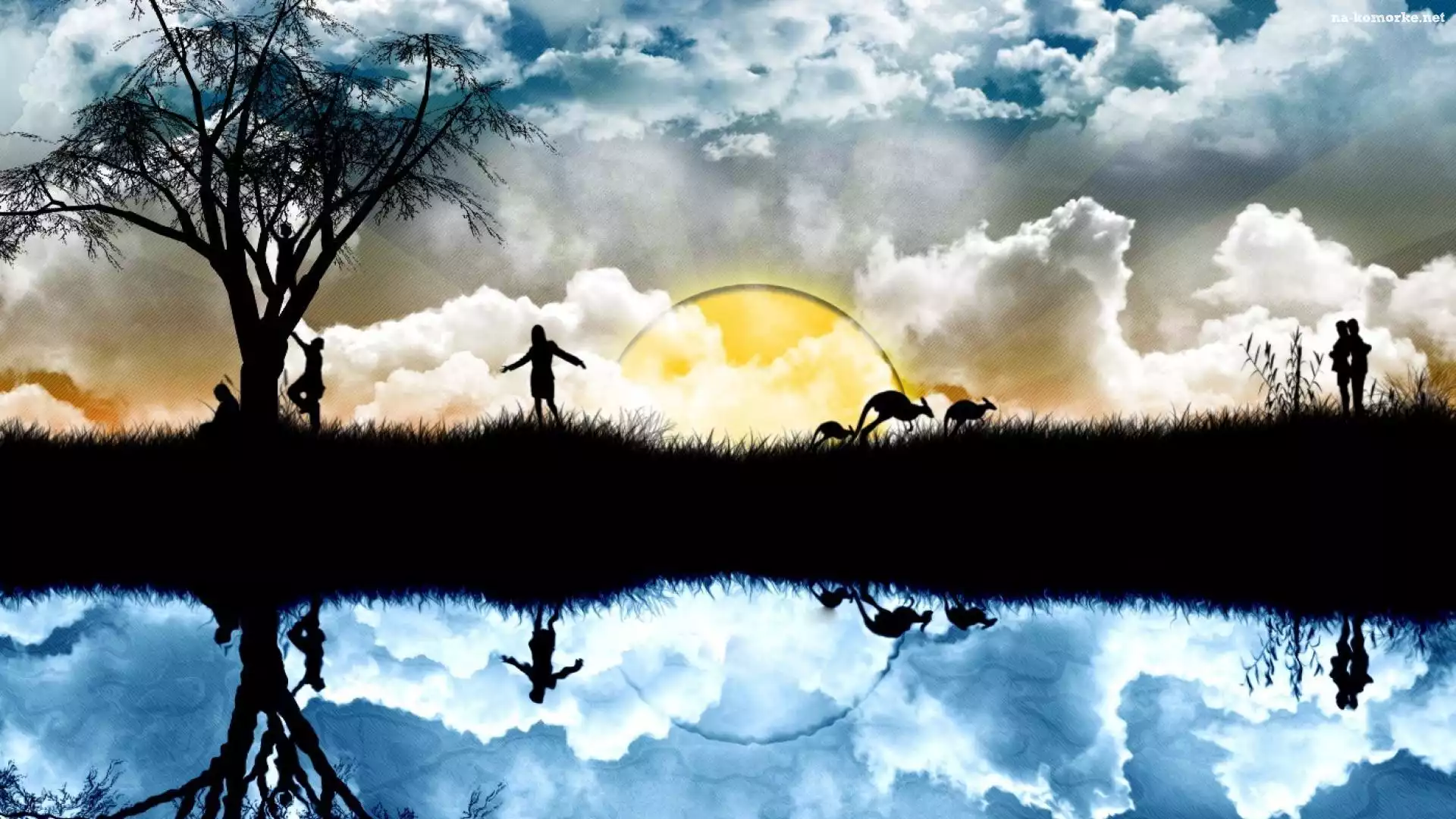 Ludzie, Chmury, Grafika, Drzewo, Rzeka, Odbicie, Słońce na Komórkę