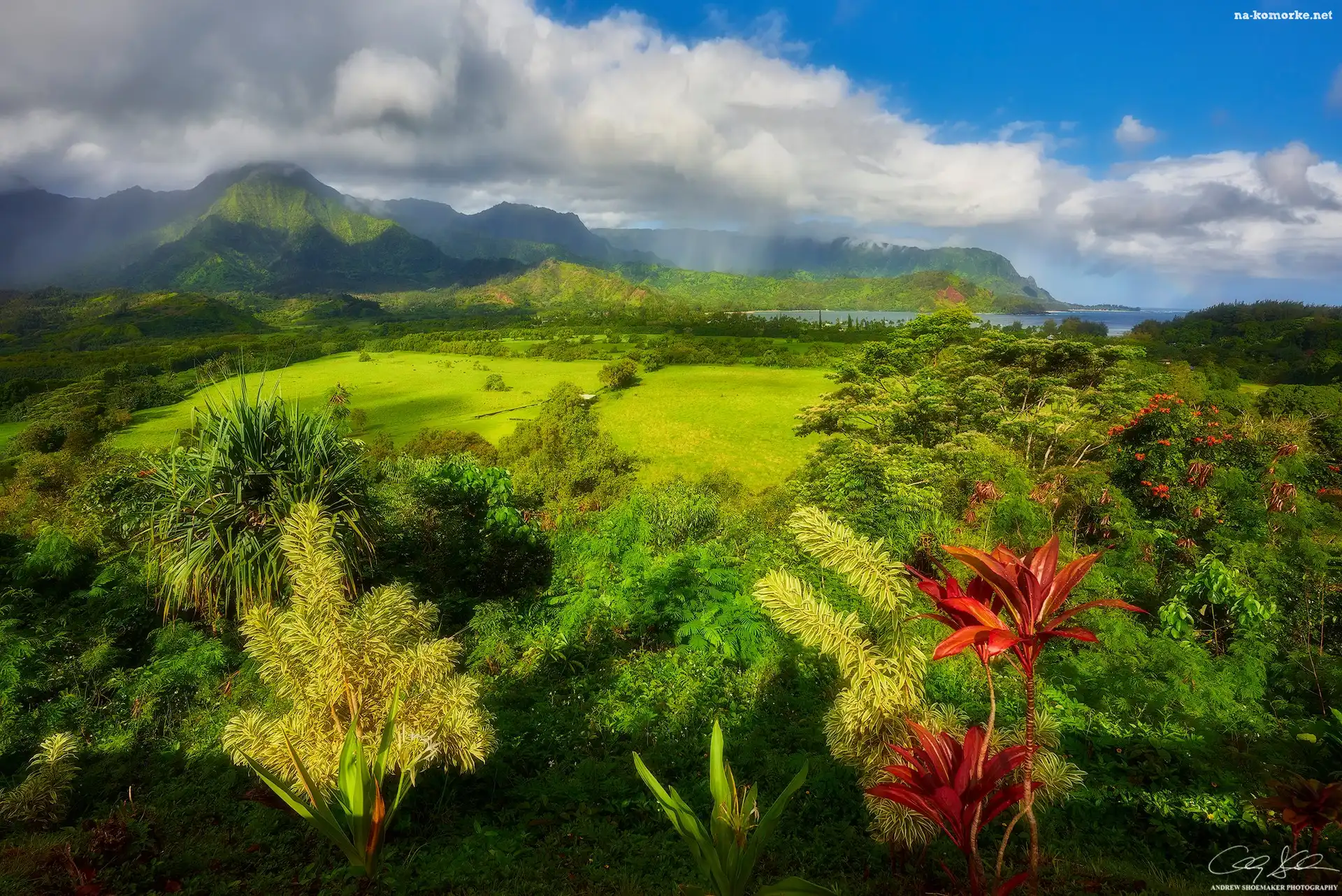Chmury, Góry, Hawaje, Roślinność, Morze, Drzewa na Komórkę
