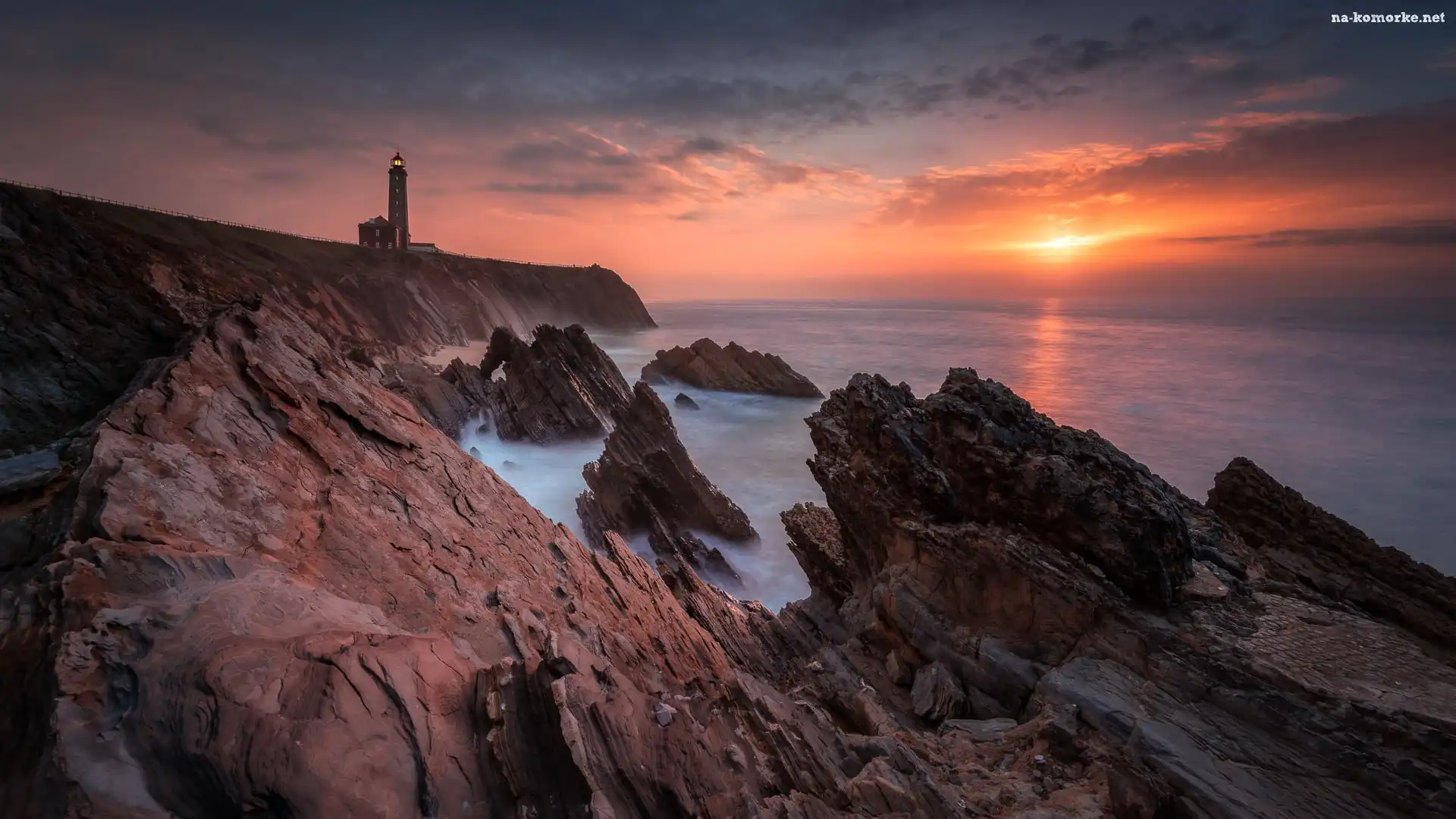 Morze, Chmury, Latarnia morska, Skały Zachód słońca na Komórkę