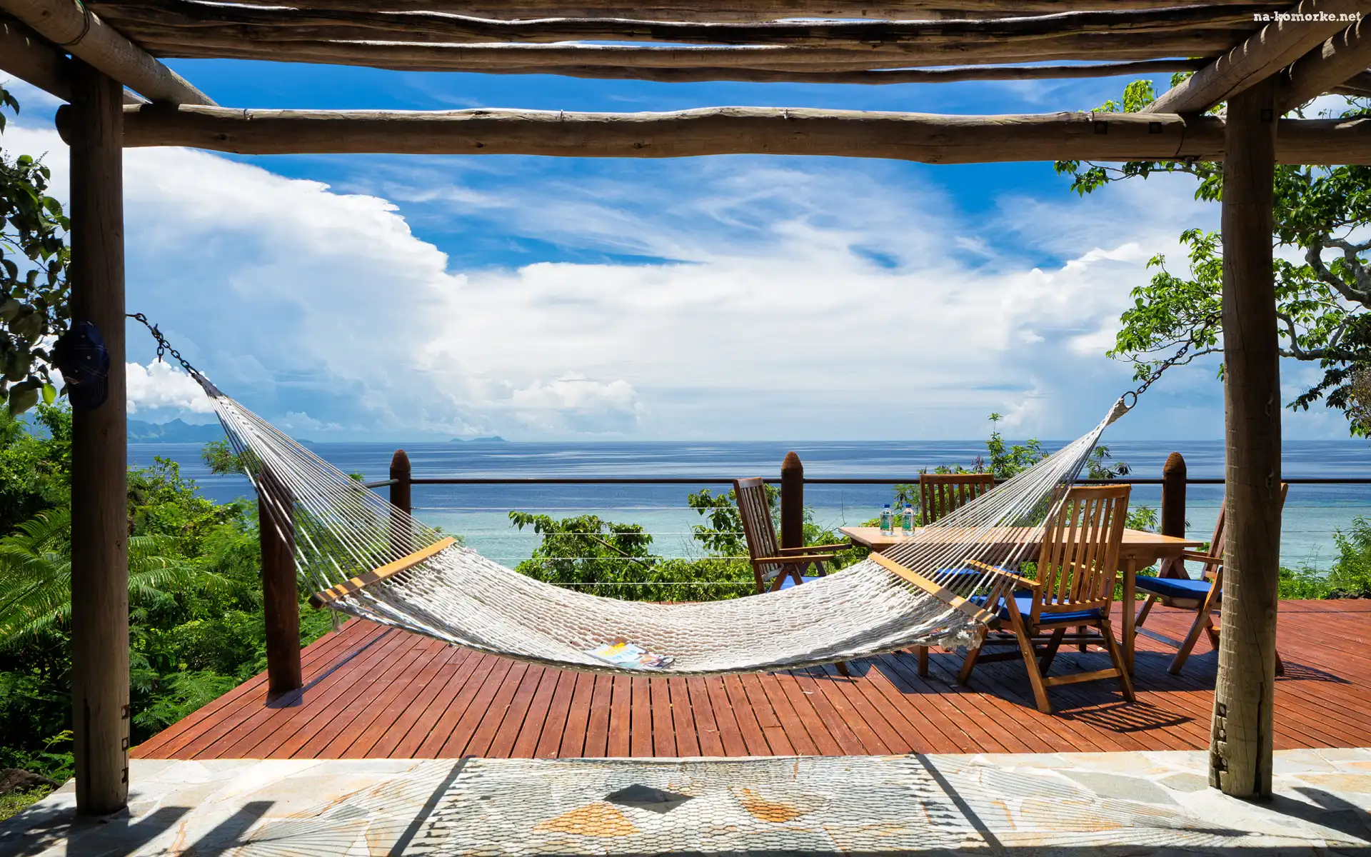 Hamak, Chmury, Stół, Wakacje, Taras, Krzesła, Morze, Niebo na Komórkę