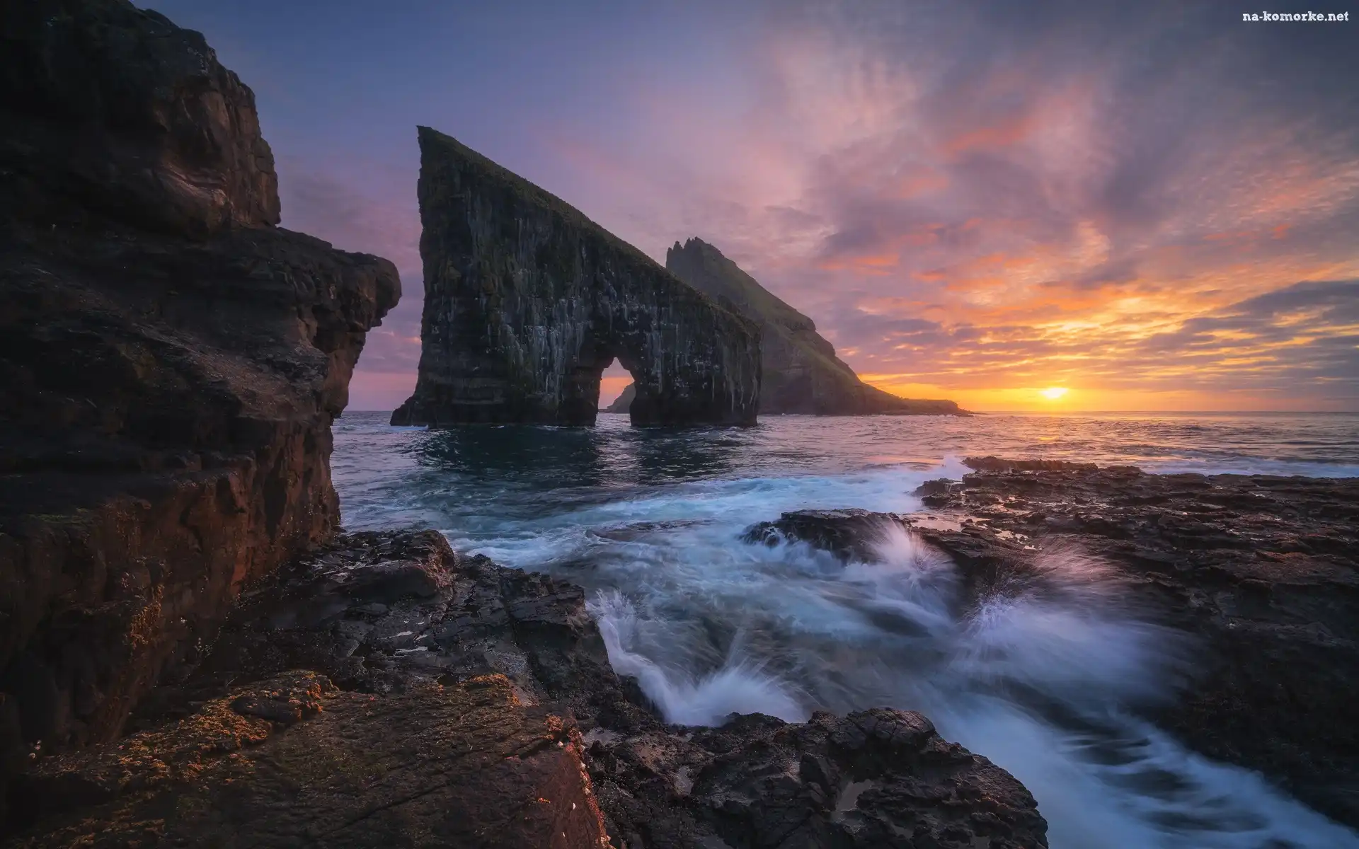 Morze, Zachód słońca, Chmury, Skały, Niebo na Komórkę