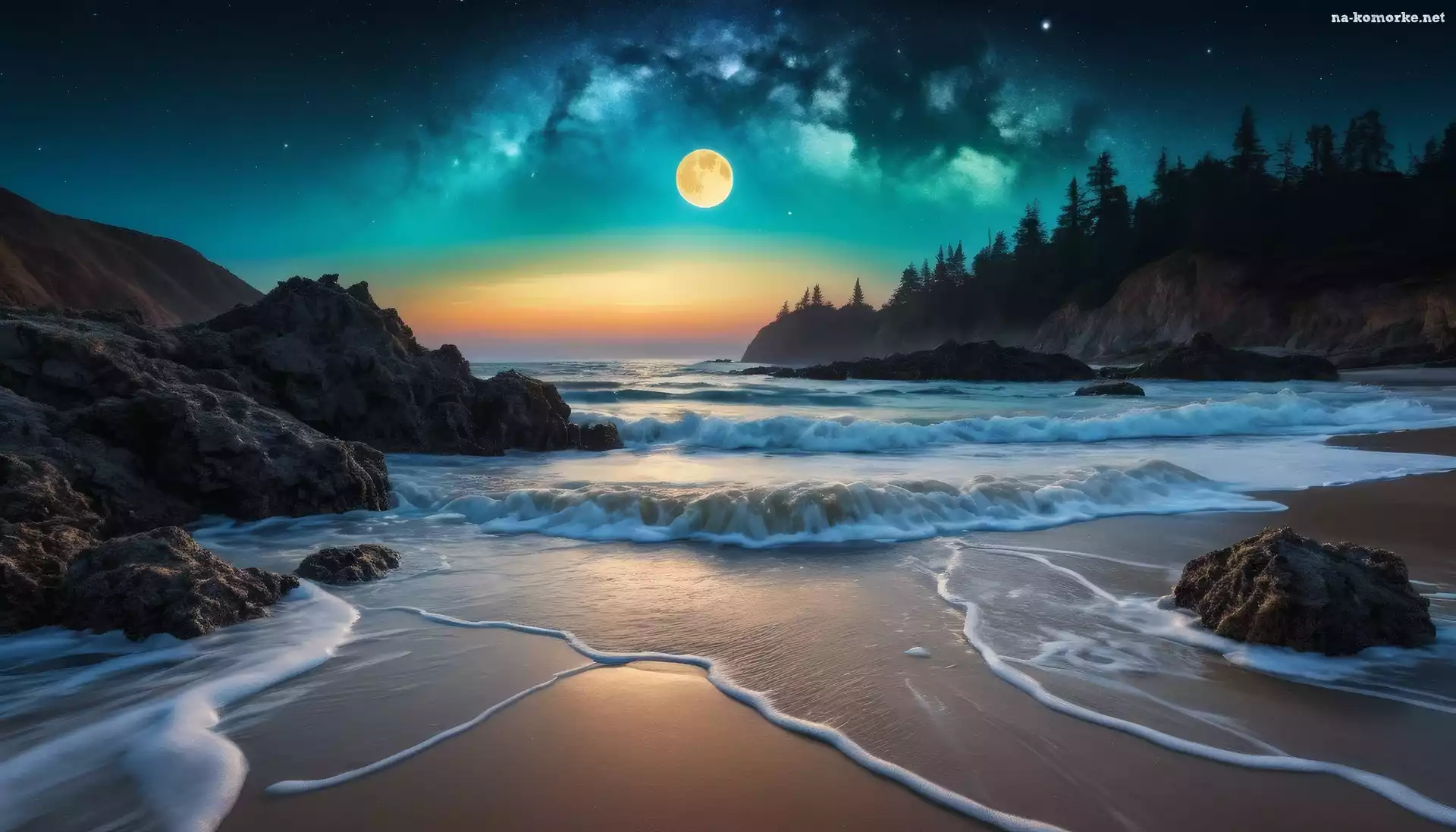 Niebo, Morze, Krajobraz, Roślinność, Plaża, Piana, Fale, Piasek, Chmury, Światło, Natura, Noc, Księżyc, Przyroda na Komórkę |