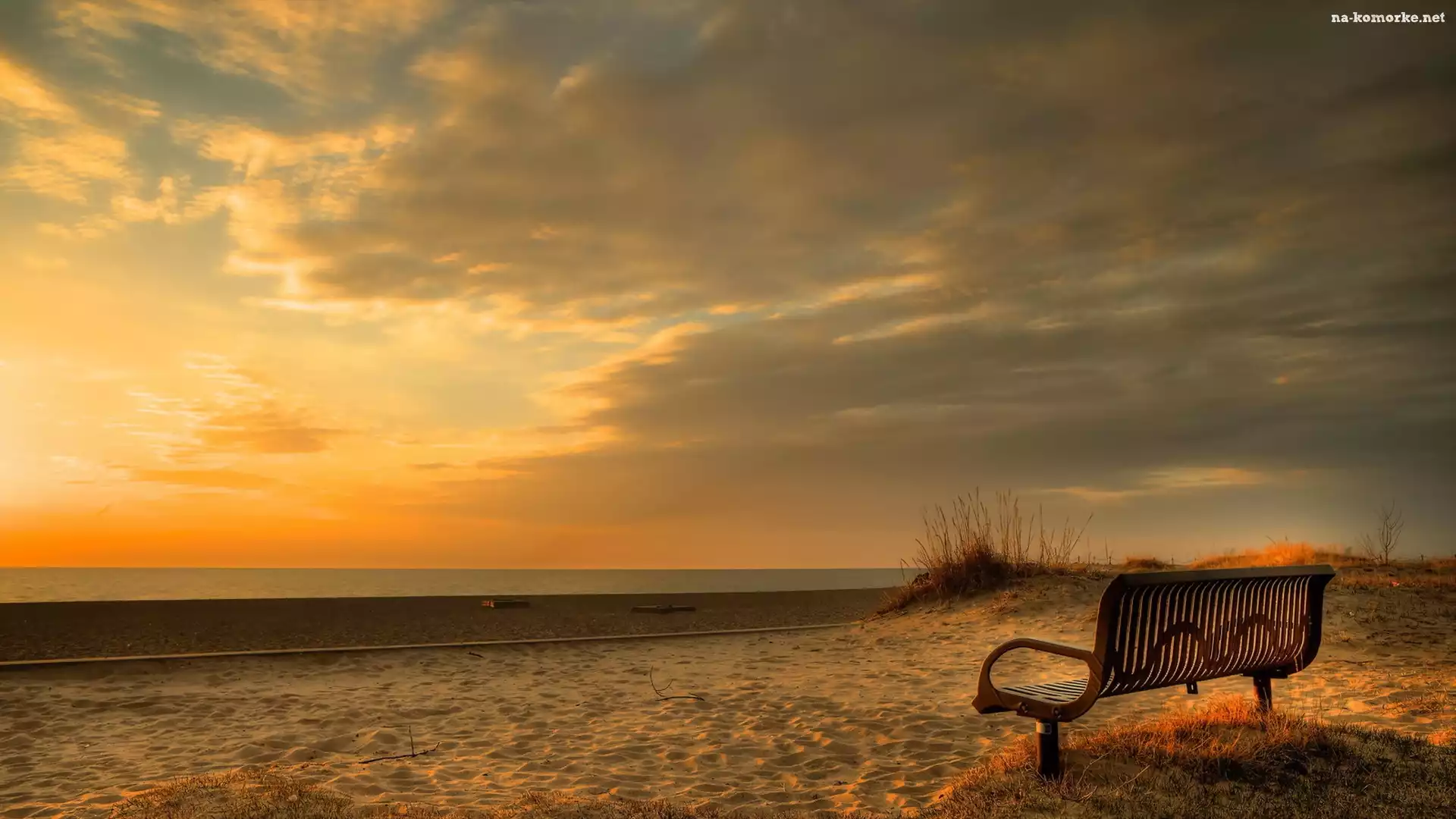 Plaża, Chmury, Morze, Ławka, Trawy, Wschód, Słońca na Komórkę