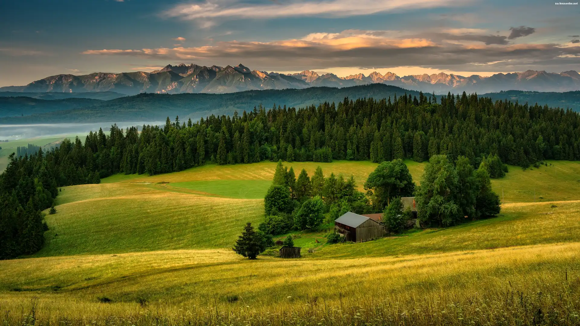 Chmury, Wzgórza, Polska, Góry, Drzewa, Las, Pole, Dom, Pieniny na Komórkę