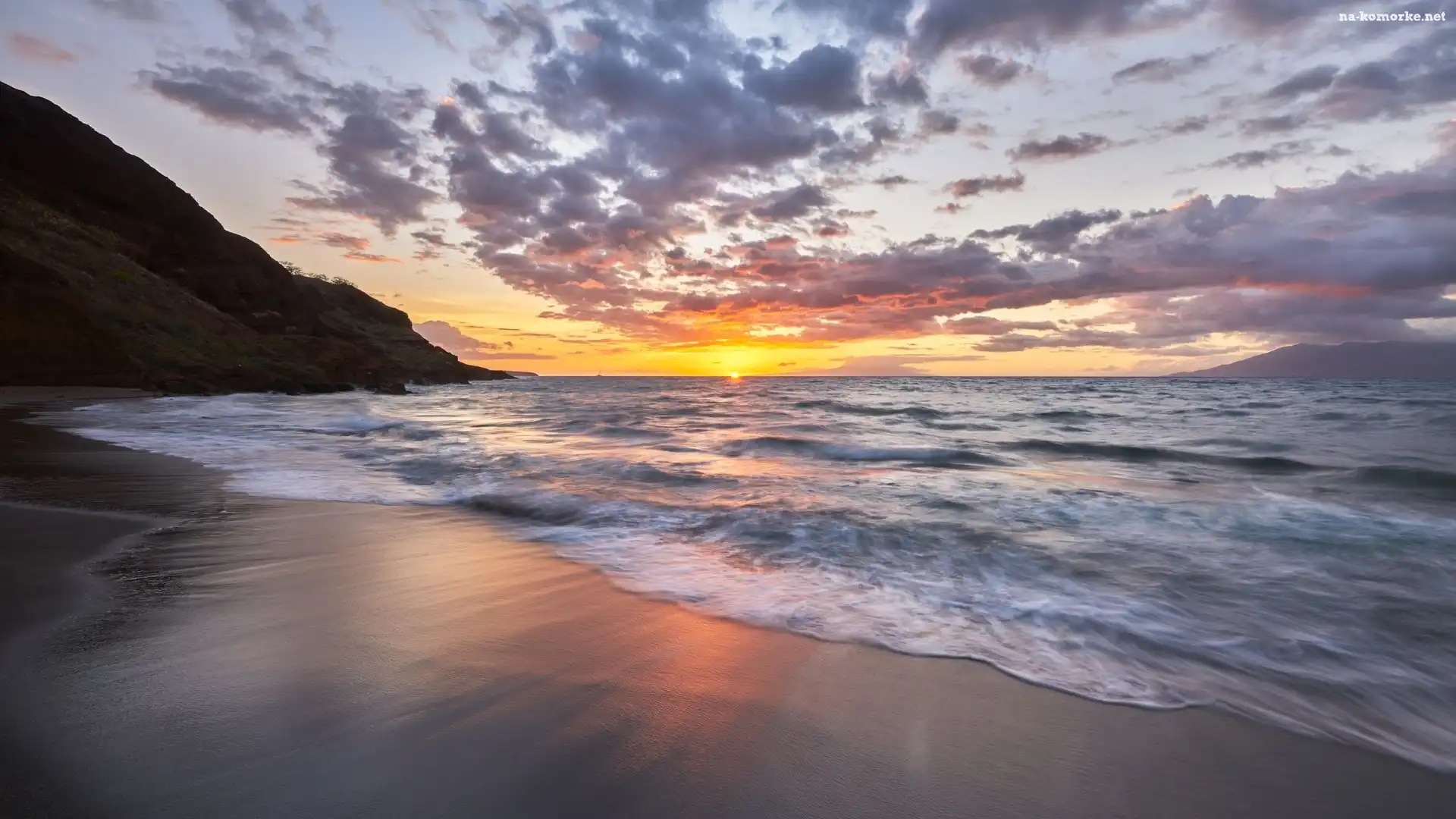 Chmury, Morze, Fale, Zachód słońca, Wzgórze na Komórkę