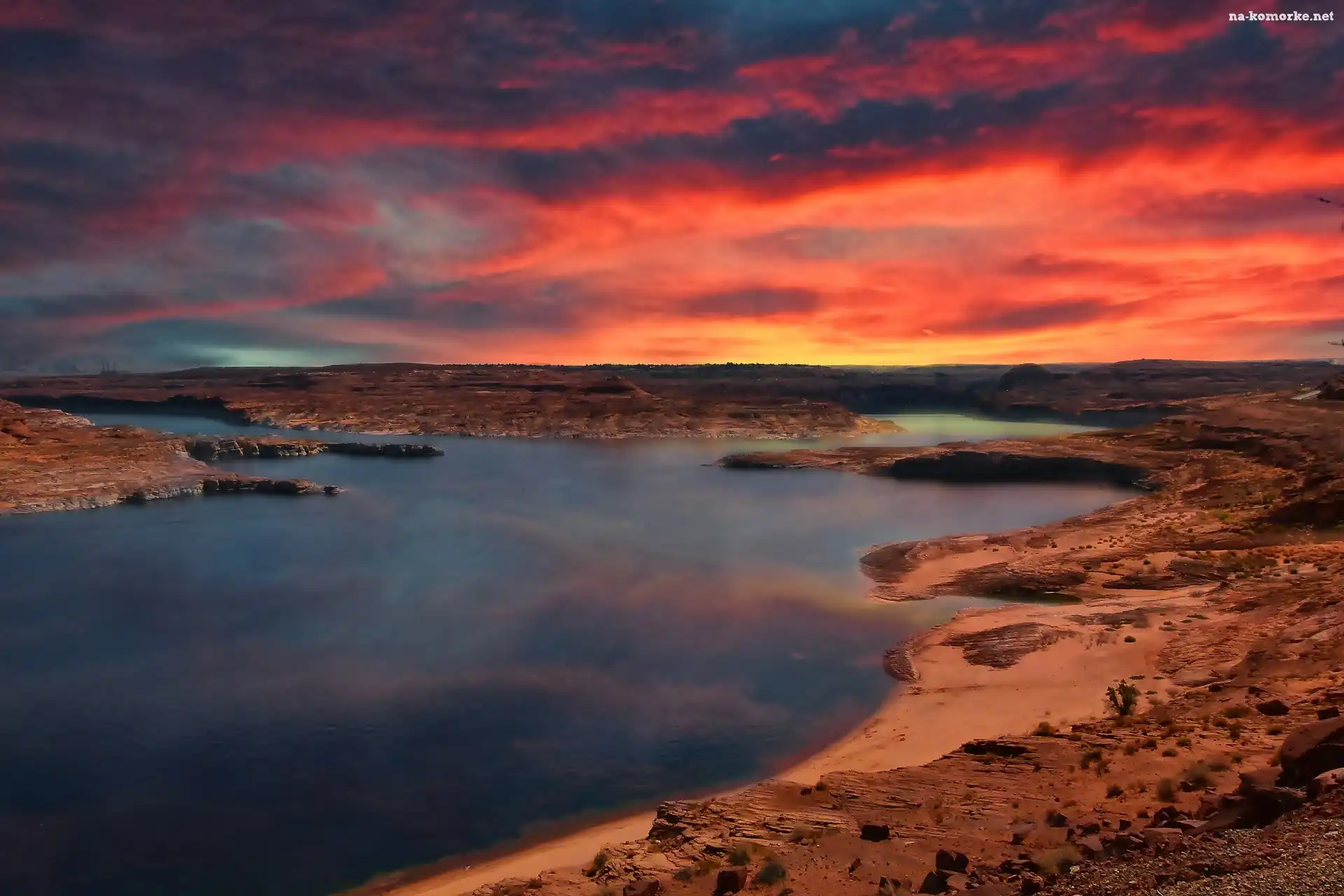 Chmury Rzeka, Wybrzeże, Zachód, Słońca, Niebo na Komórkę