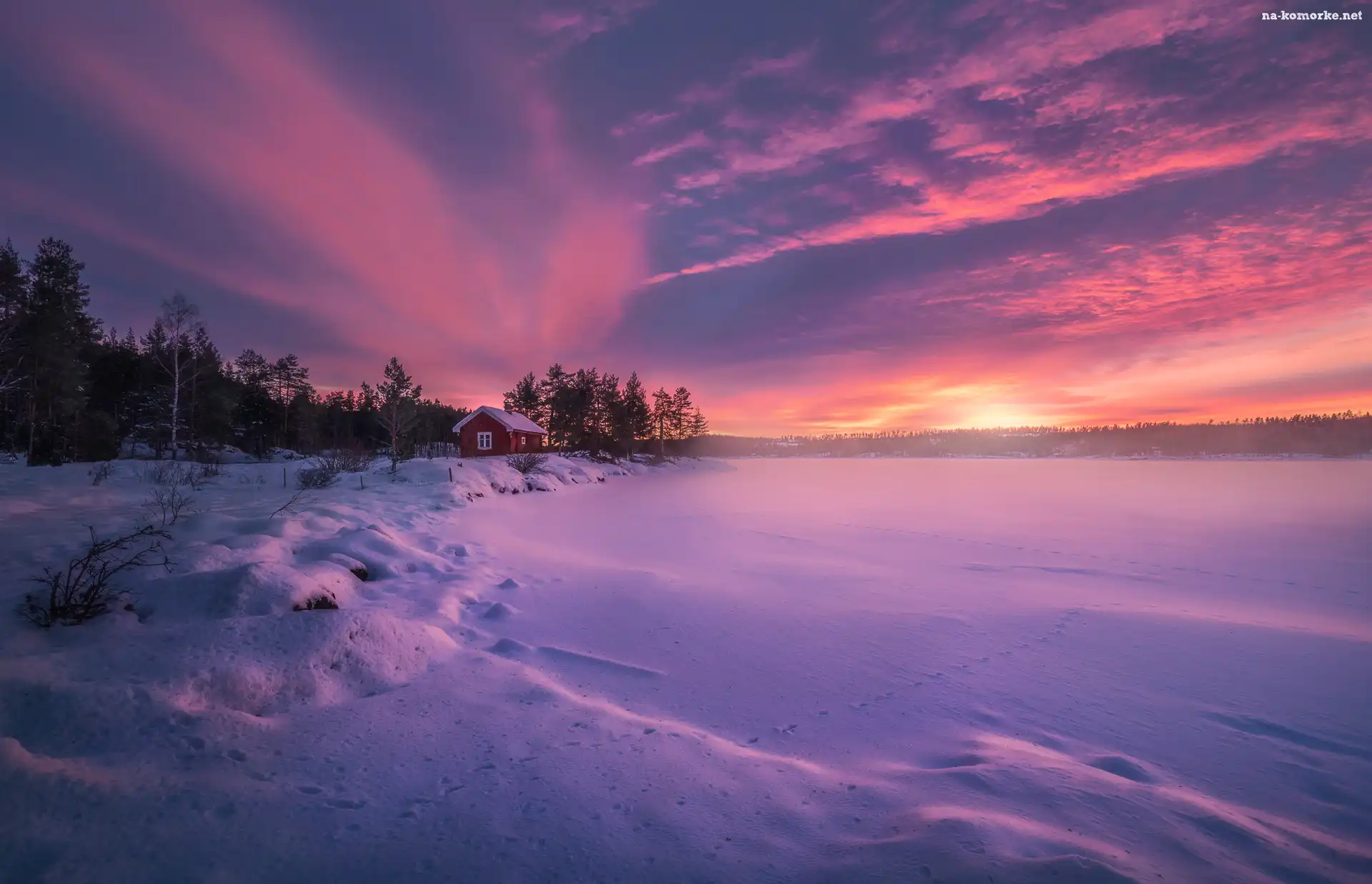 Norwegia, Zachód słońca, Jezioro, Zima, Ringerike, Drzewa, Dom, Chmury na Komórkę