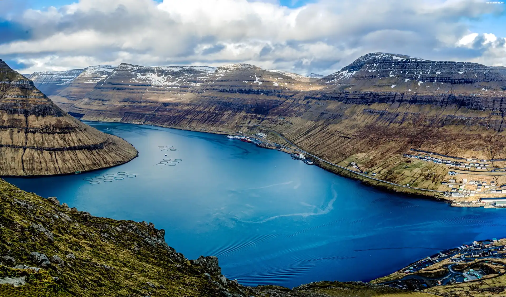 Dania, Góry, Statki, Wyspy, Domy, Jezioro, Drogi, Owcze, Chmury na Komórkę