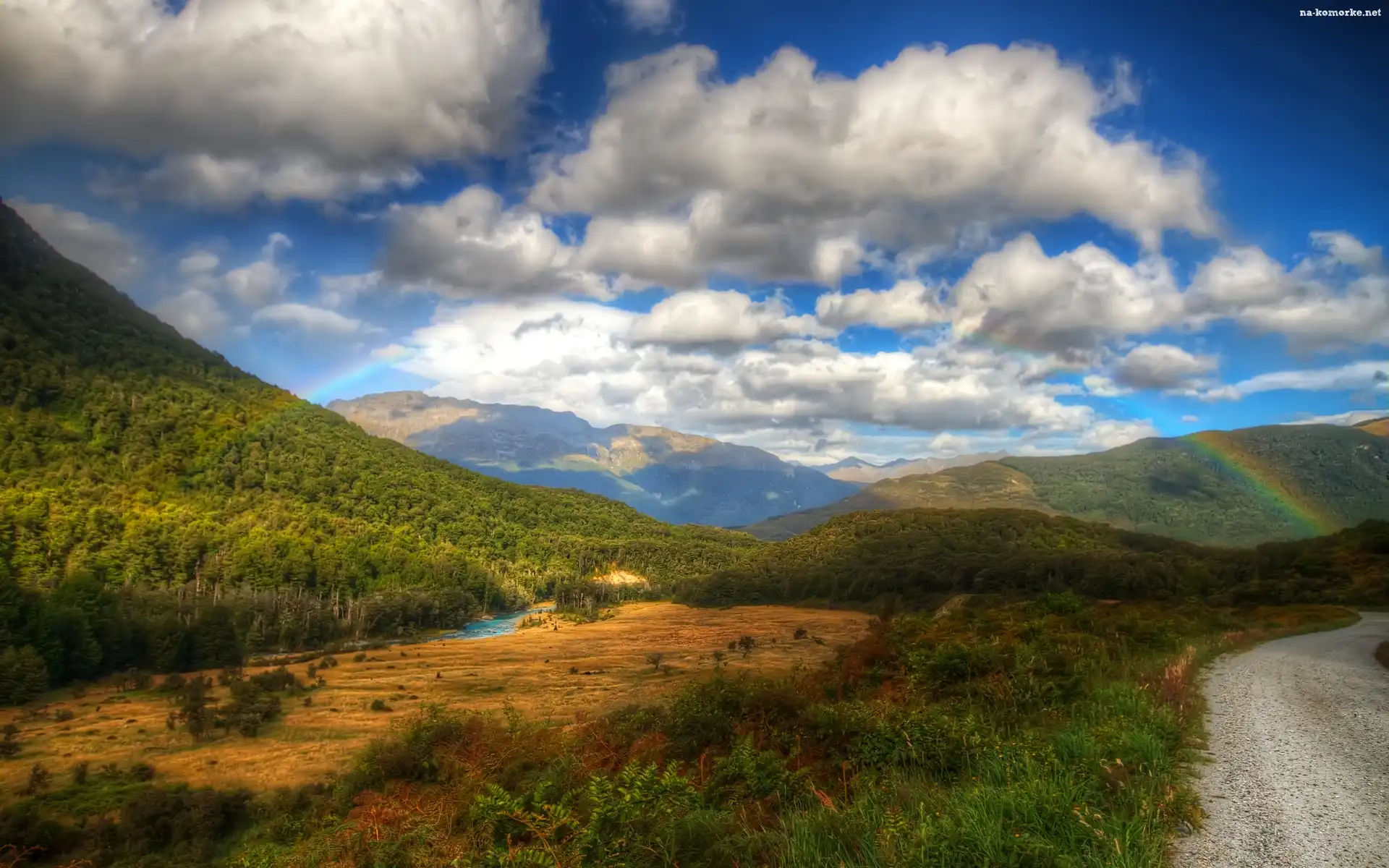 Niebo, Chmury Drzewa, Niebo, Stok Droga, Tęcza, Lasy Góry Niebo, Drzewa, Chmury Góra, Drewniana chatka Tęcza, Zamek Kilkenny, Kilkenny Castle, Irlandia, Ogród Kobieta, Wiatr Góry, Morze, Tęcza Góry Chmury, Tęcza, Niebo Góry Wodospad Tęcze Górskie, Łódki, Zbocza, Jezioro