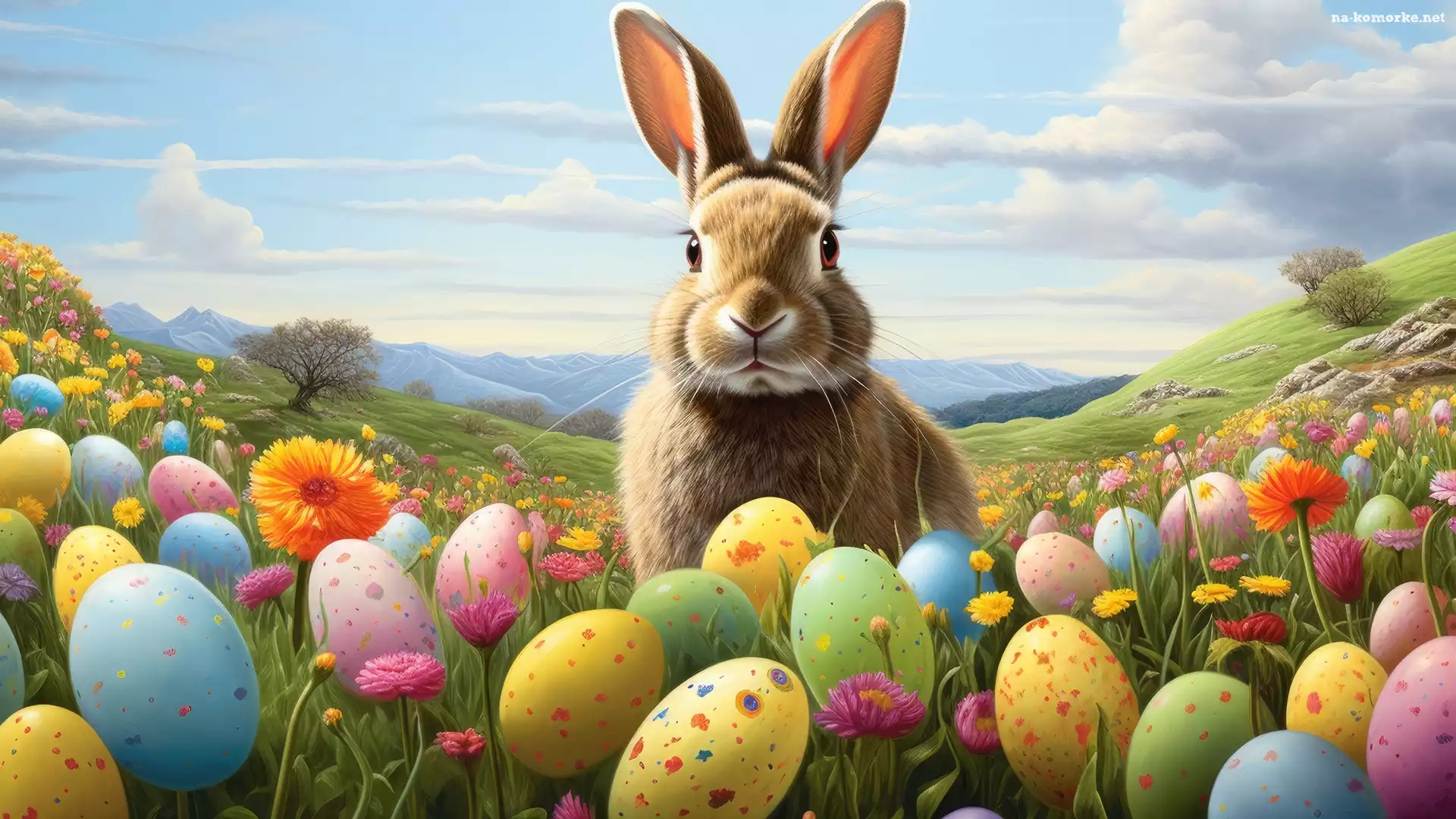 Kwiaty, Drzewa, Wielkanoc, Chmury, Pisanki, Królik, Łąka na Komórkę