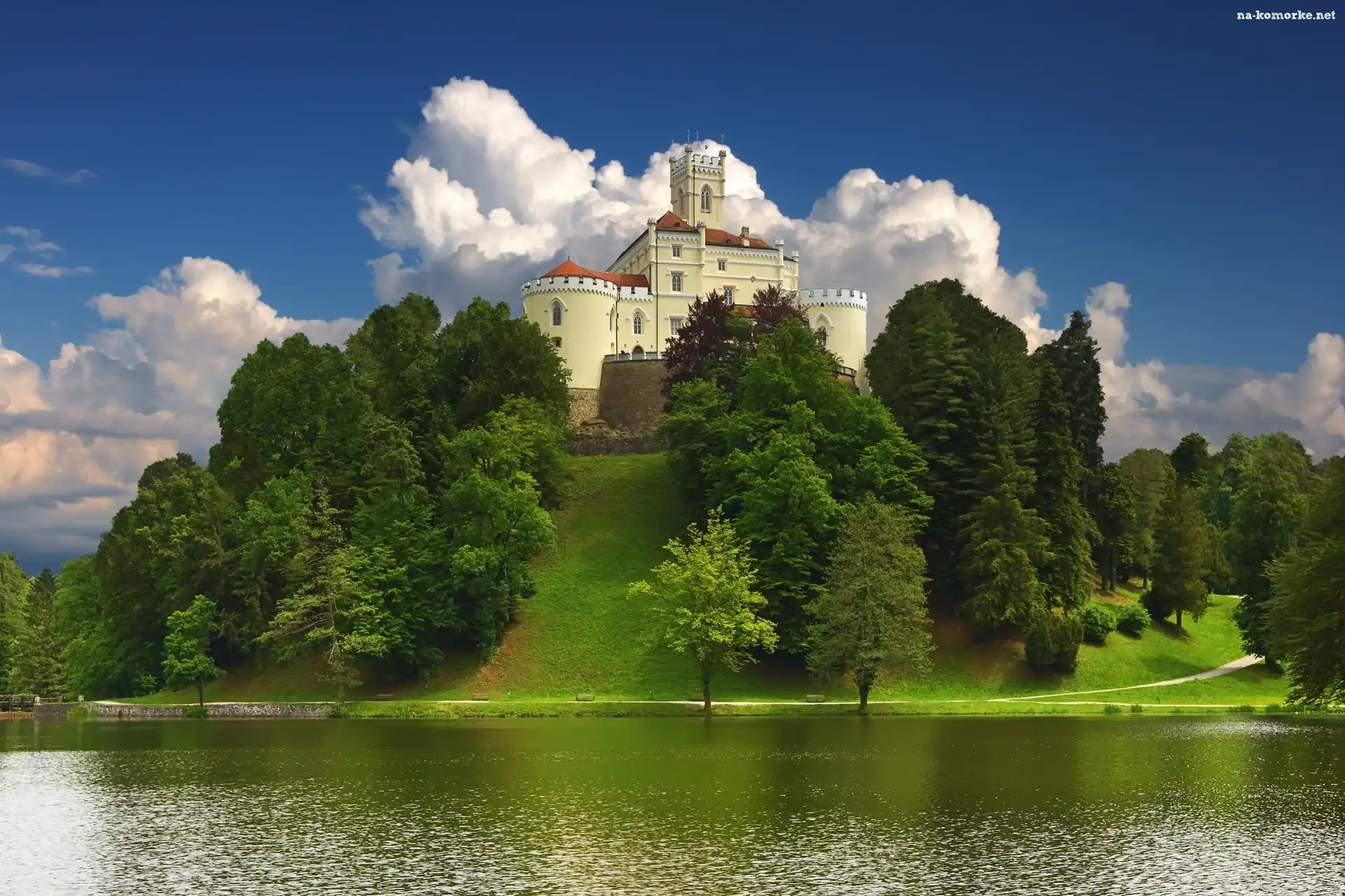 Chmury, Zamek, Wzgórze, Woda, Drzewa na Komórkę