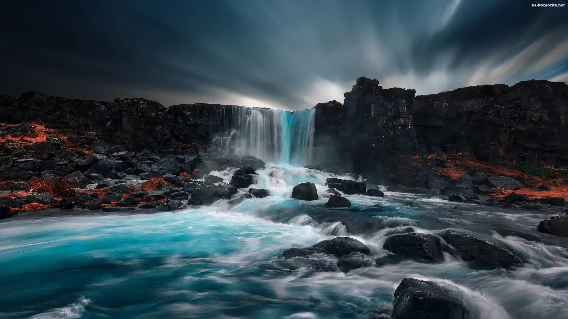Chmury, Skały, Kamienie, Wodospad, Rzeka na Komórkę