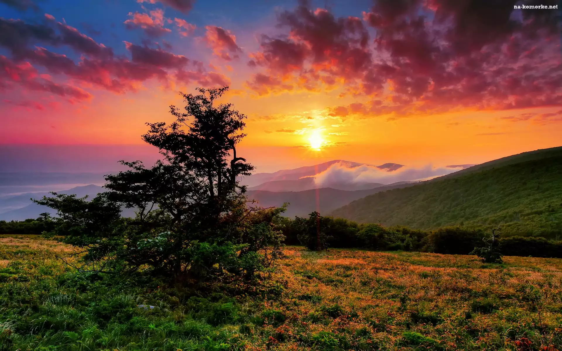 Chmury, Drzewo, Łąki, Góry, Zachód Słońca na Komórkę