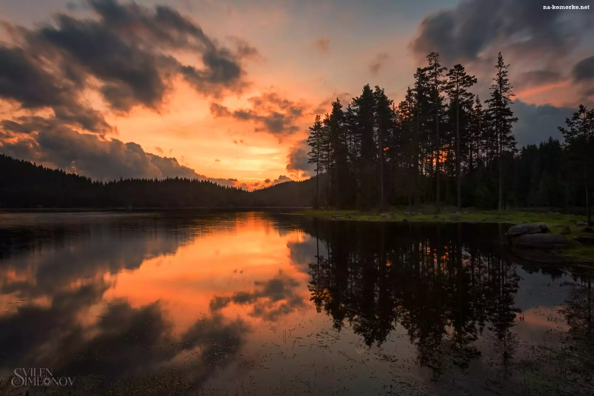 Chmury, Jezioro, Drzewa, Las, Zachód słońca na Komórkę