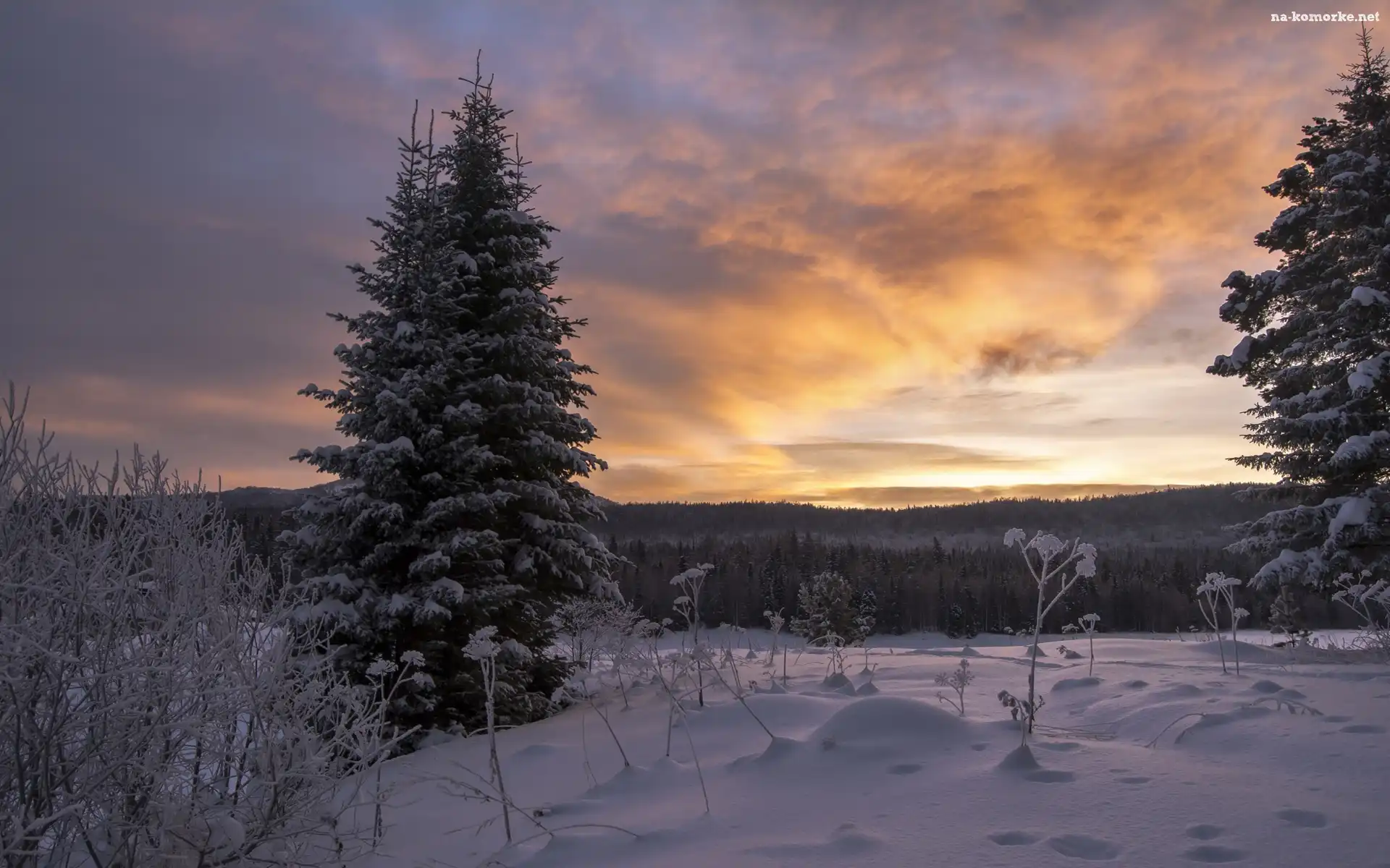 Chmury, Zima, Drzewa, Las, Zachód słońca na Komórkę