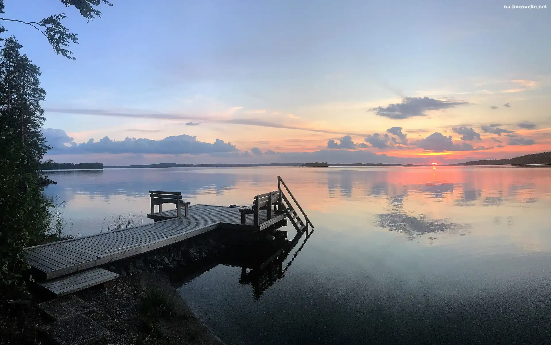Chmury, Jezioro, Pomost, Ławka, Zachód słońca na Komórkę