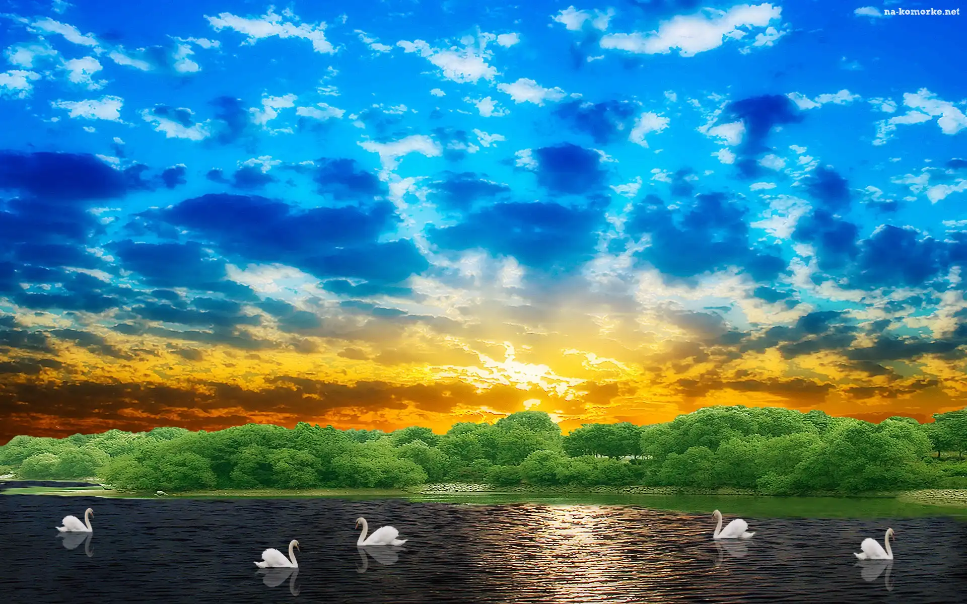 Łabędzie, Zachód, Słońca, Chmury, Jezioro na Komórkę