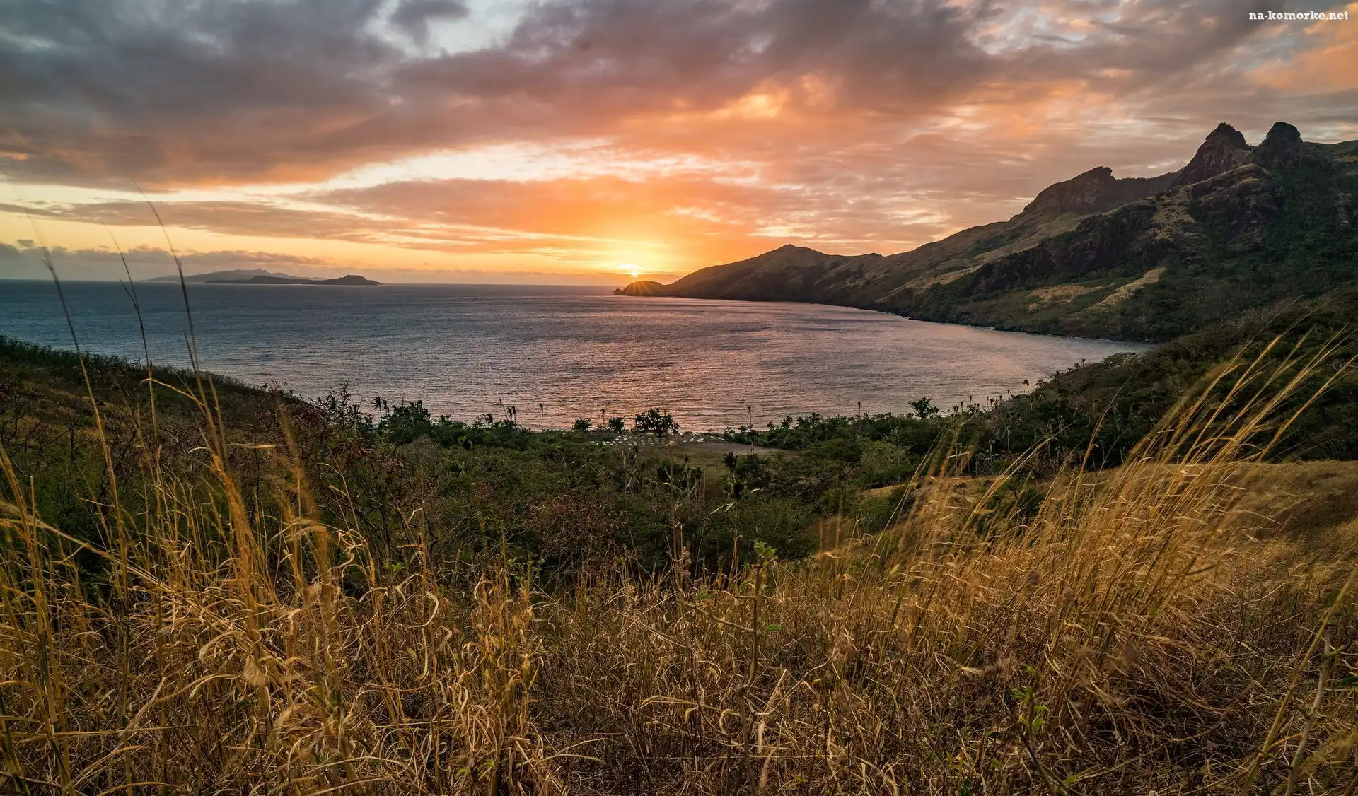 Chmury, Morze, Wzgórza, Wybrzeże, Zachód słońca na Komórkę