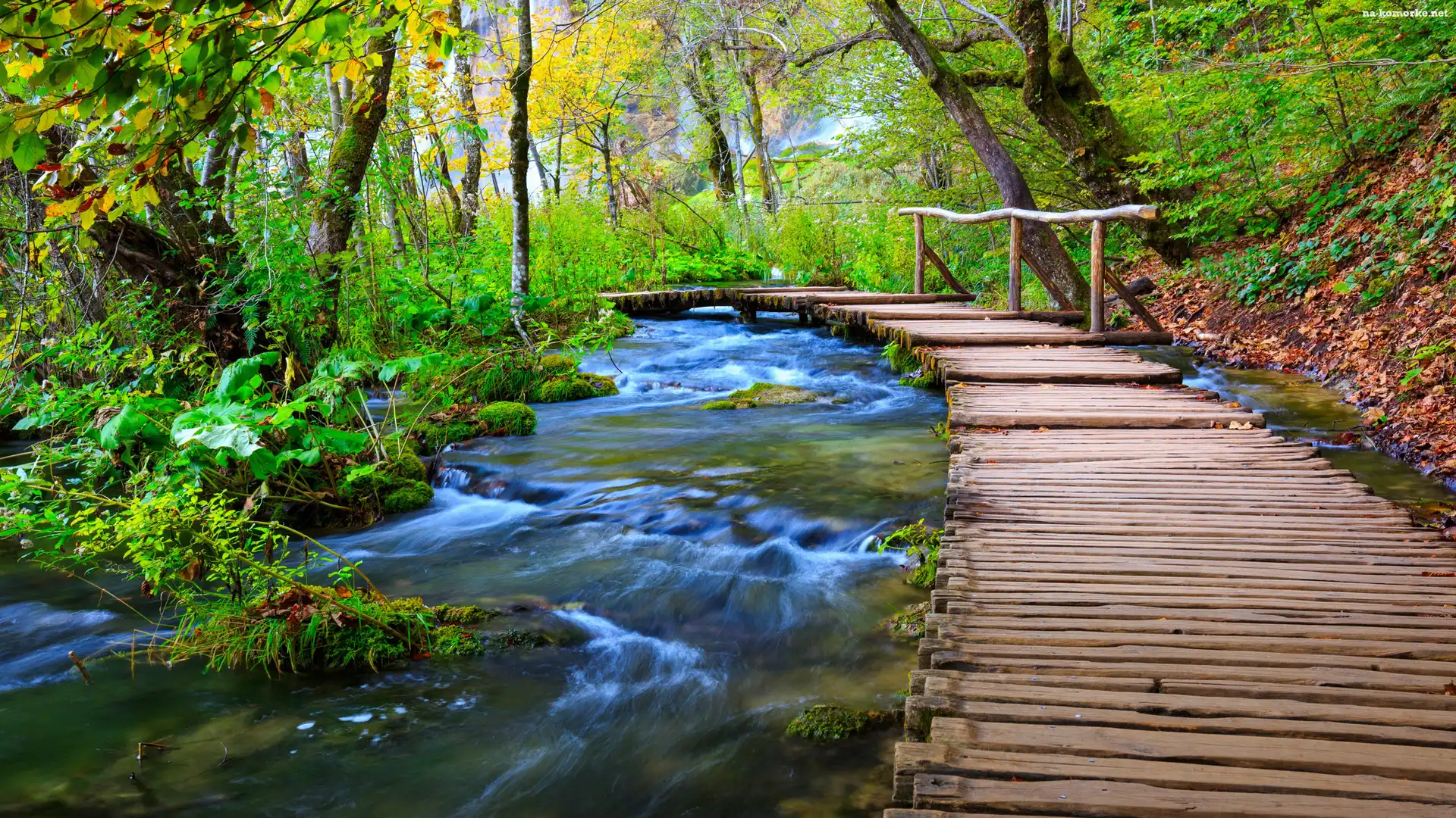 Rzeka, Chorwacja, Park Narodowy Jezior Plitwickich, Las, Pomost na Komórkę