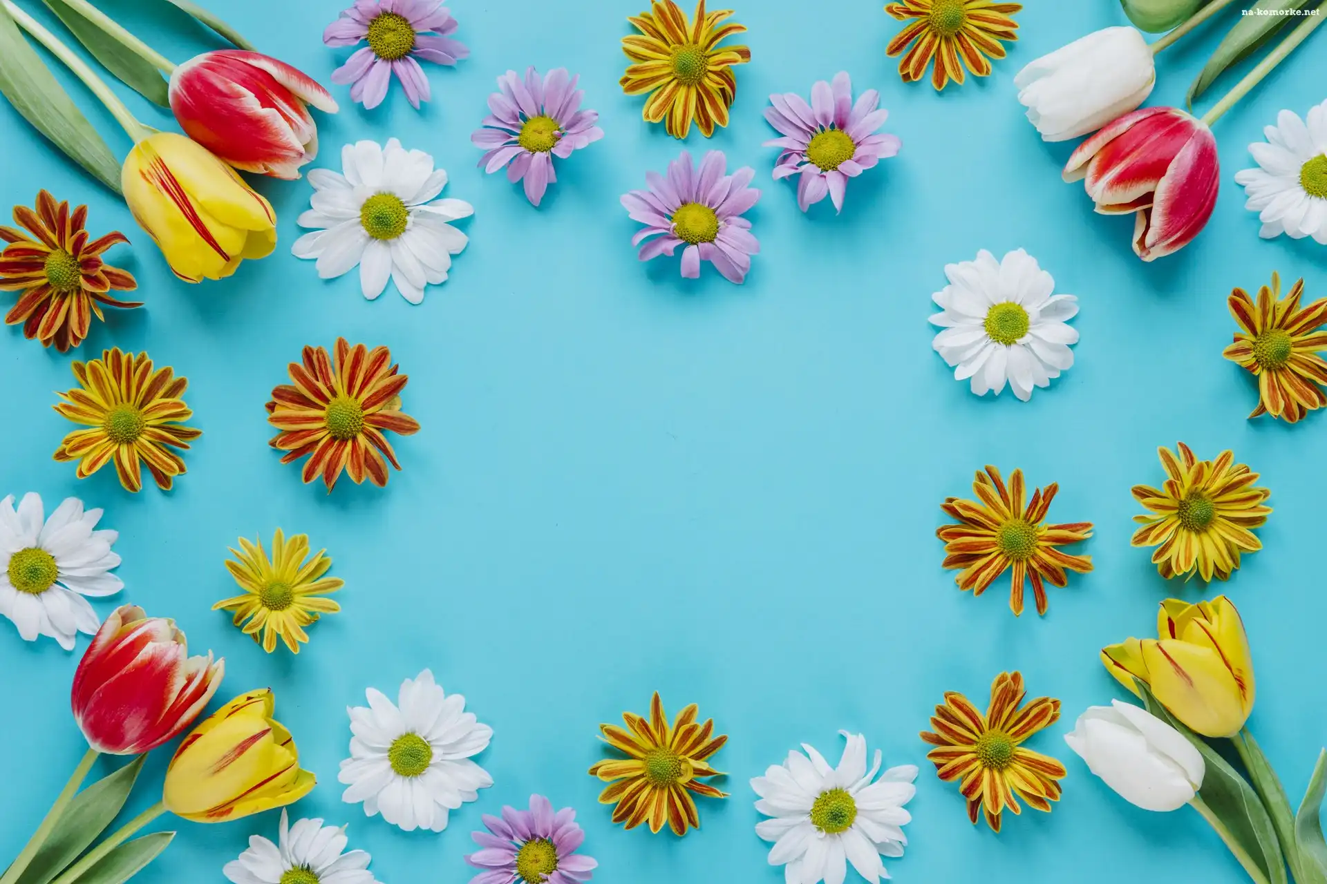 Chryzantemy, Kolorowe, Kwiaty, Tło, Tulipany, Niebieskie na Komórkę