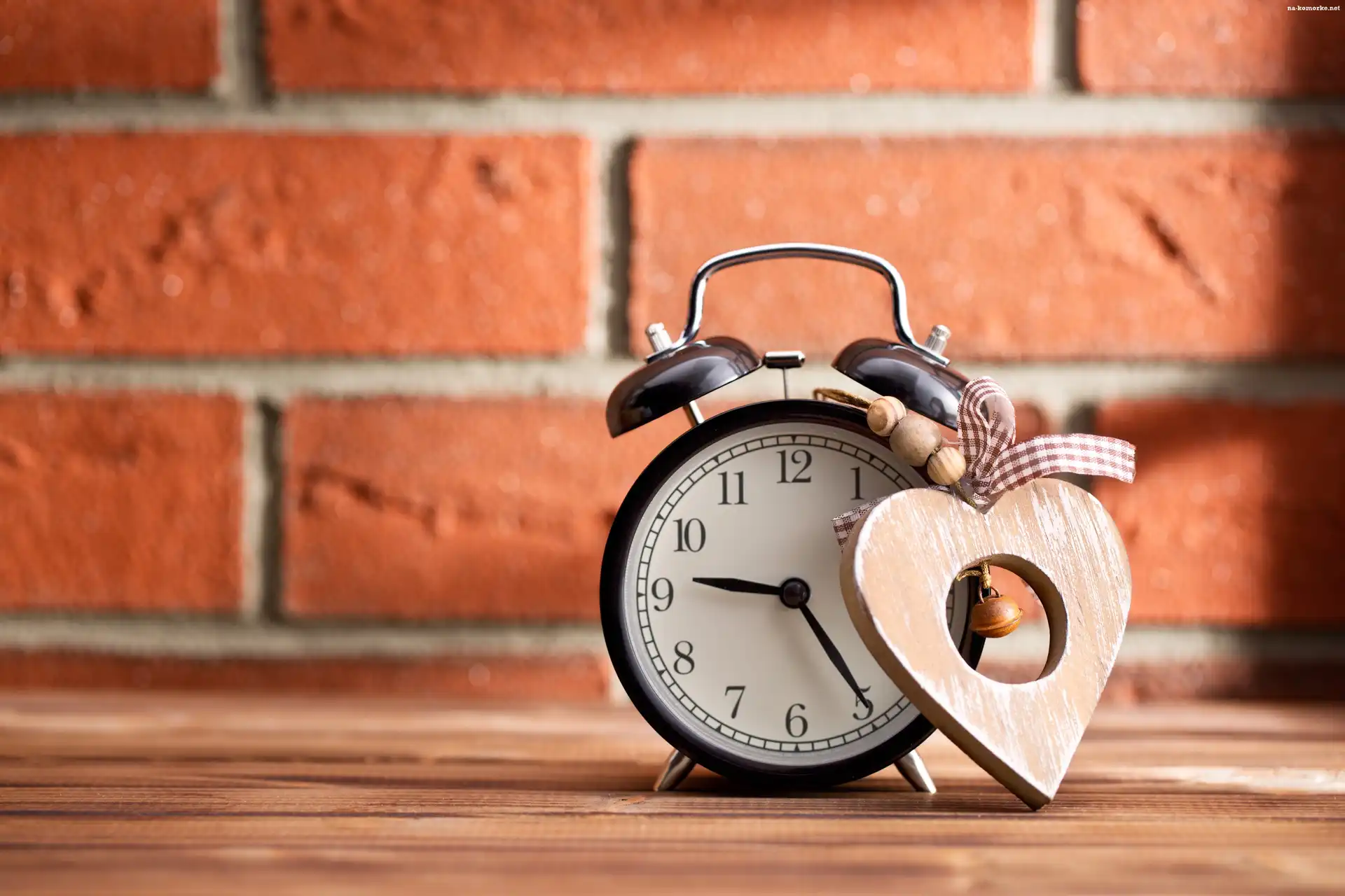 Kompozycja, Ściana, Cegły, Budzik, Zawieszka, Drewniane, Serduszko na Komórkę