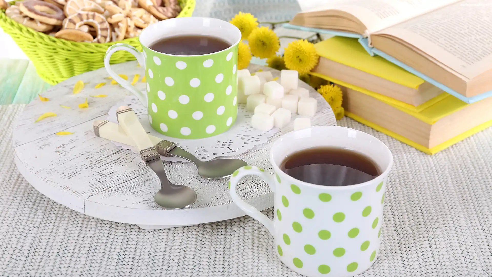 Ciasteczka, Kubki, Herbata, Książki, Cukier, Koszyk na Komórkę