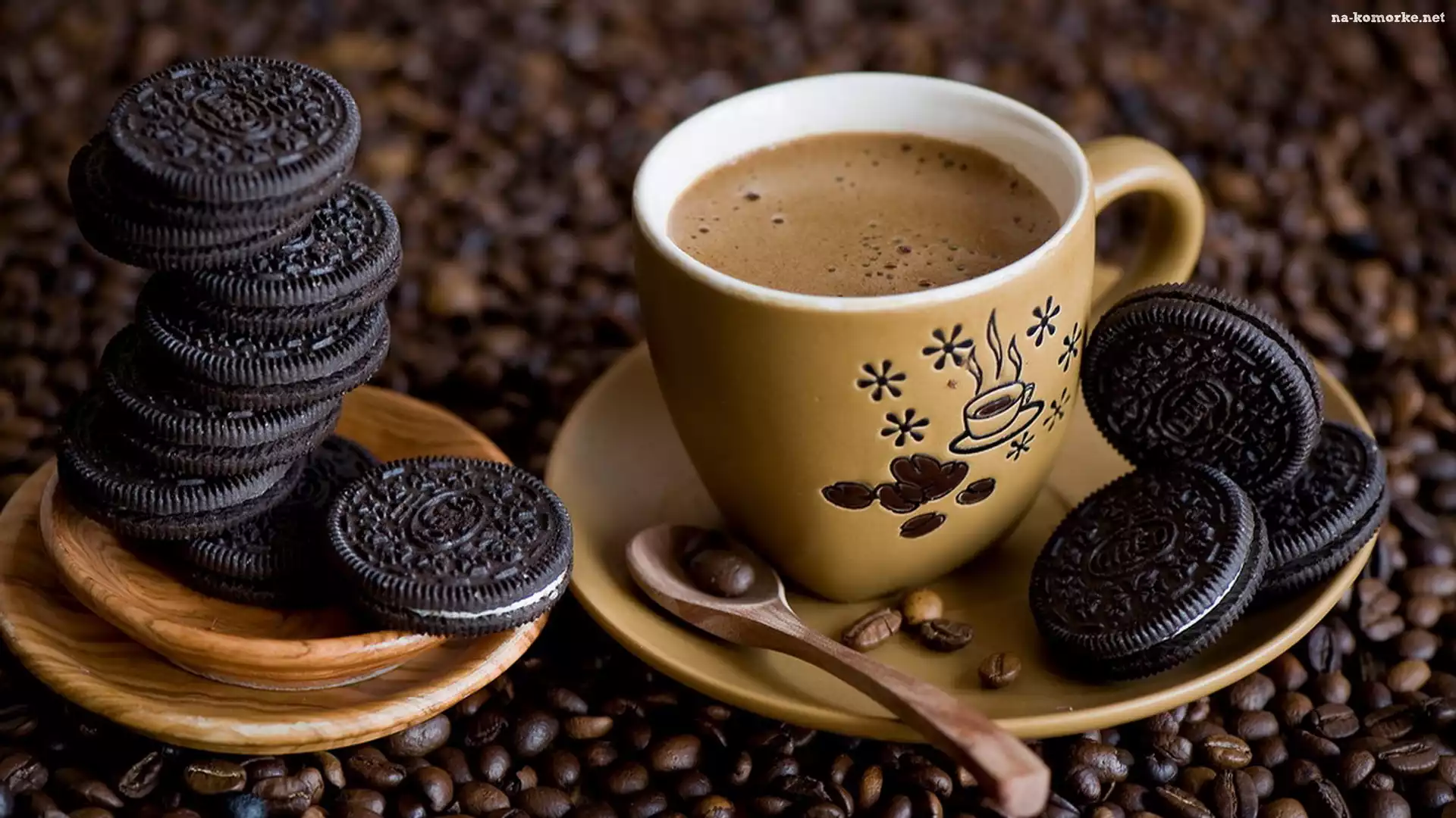 Ciasteczka, Filiżanka, Kawa, Łyżeczka, Ziarna, Talerzyk na Komórkę