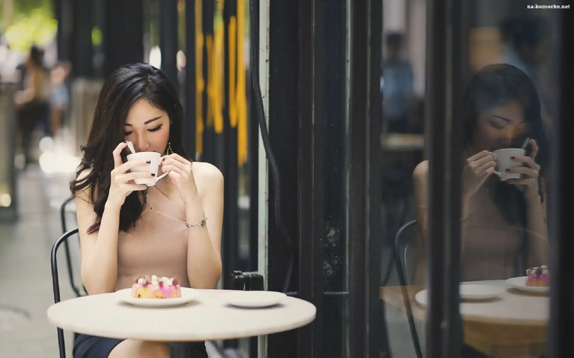 Kobieta, Ciastko, Taras, Odbicie, Kawiarnia, Stolik, Filiżanka, Talerzyk na Komórkę